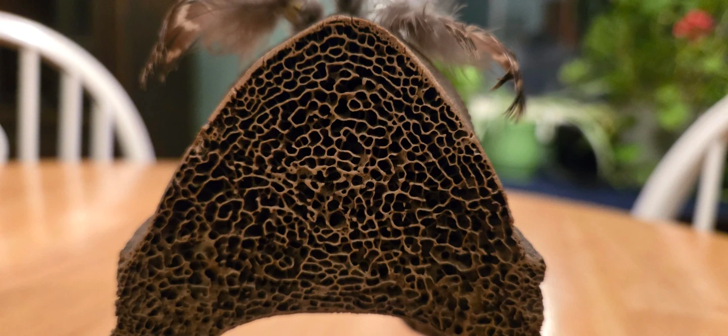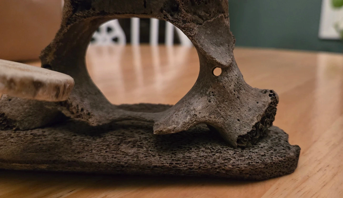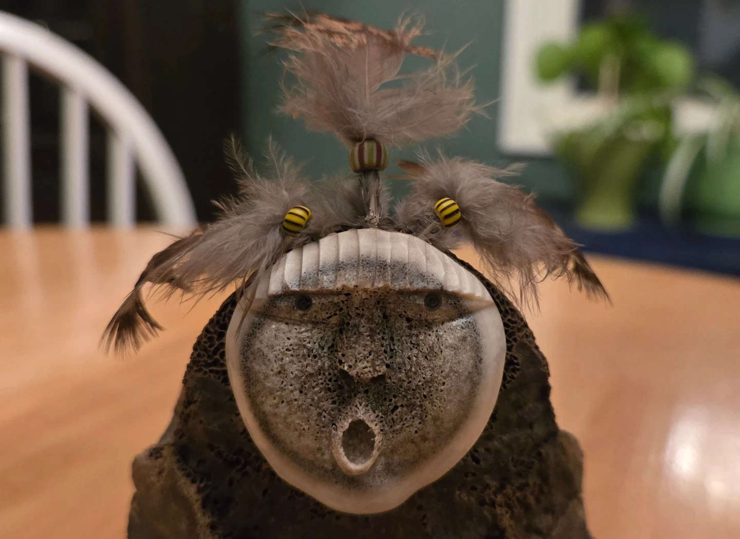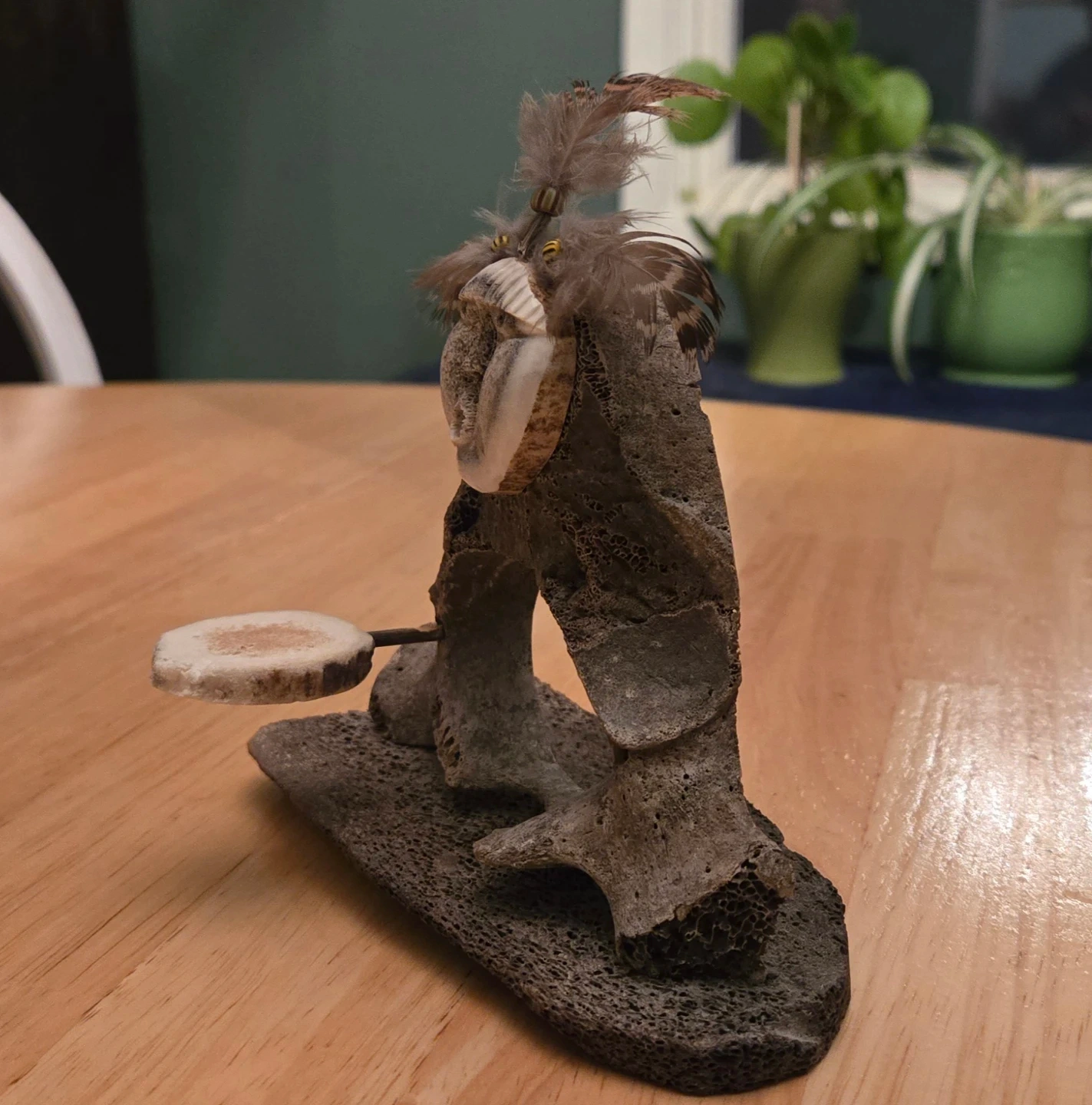 Has a carved face (looks like walrus ivory), and feathers with beads.