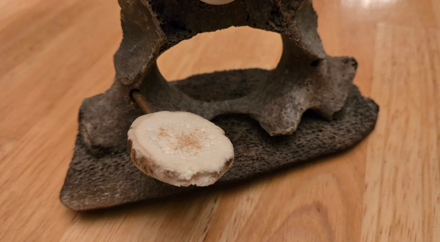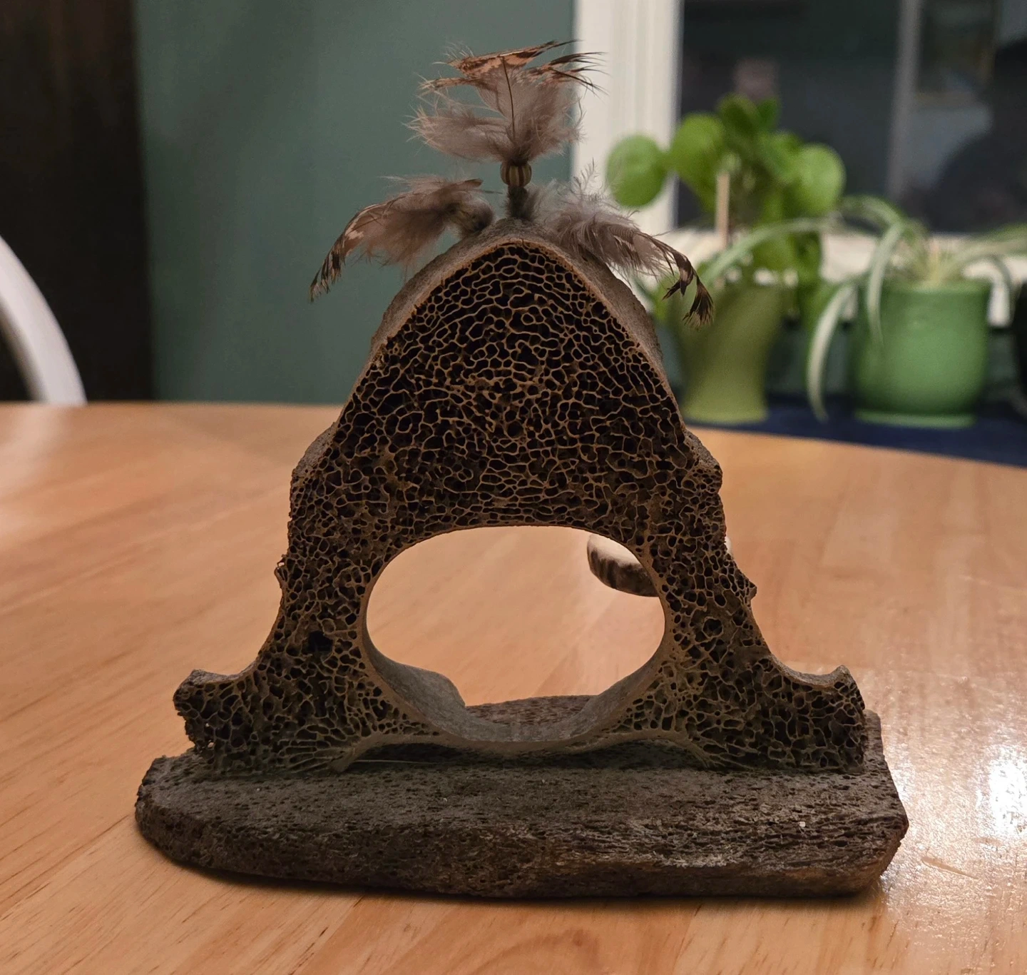 Has a carved face (looks like walrus ivory), and feathers with beads.