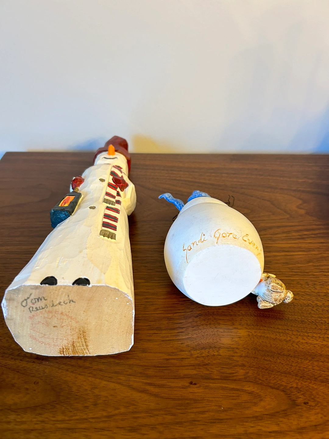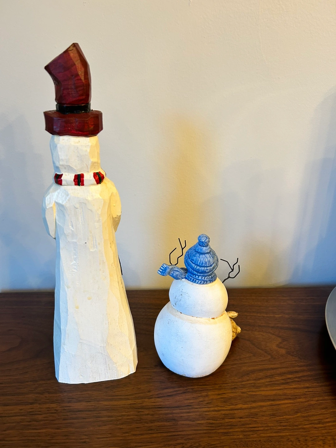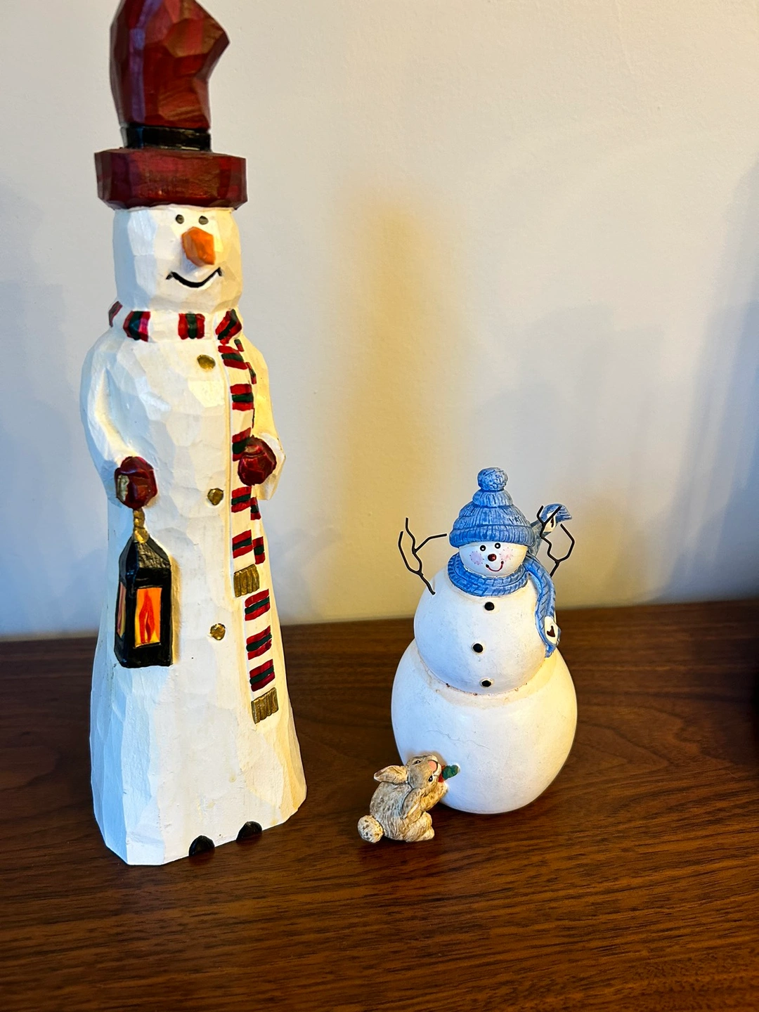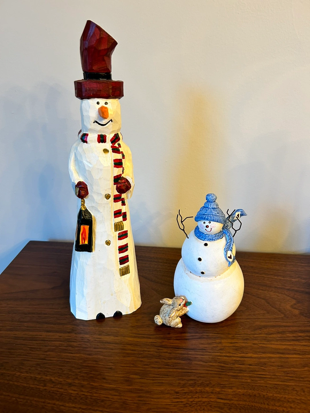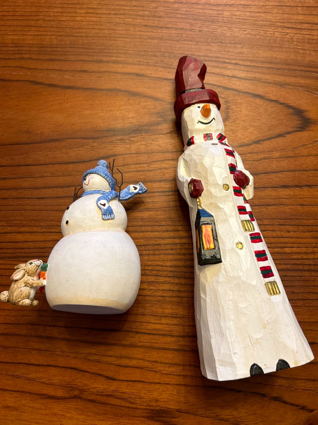 - Adorable rustic snowman figurines, perfect to decorate a mantle in wintertime.