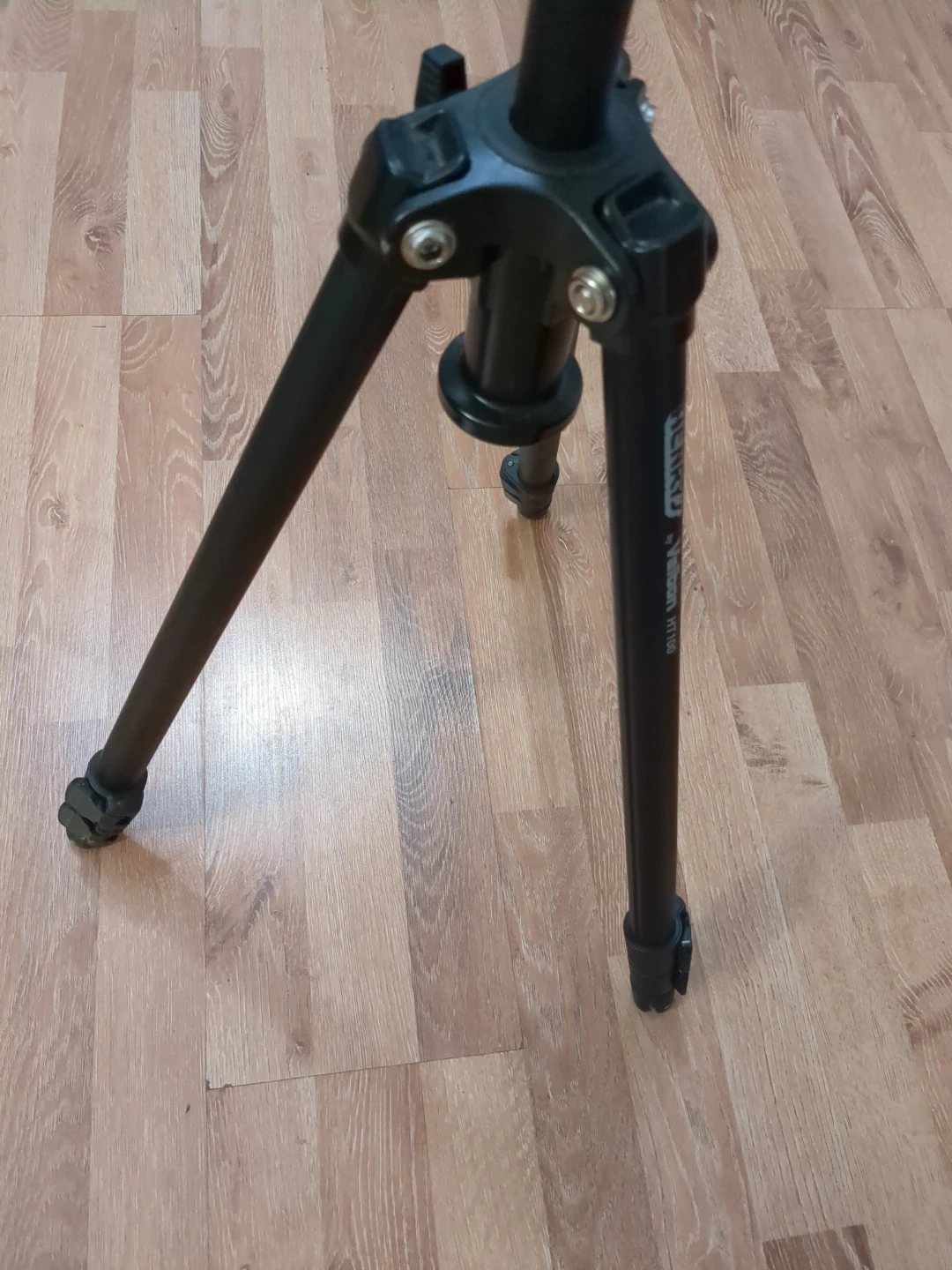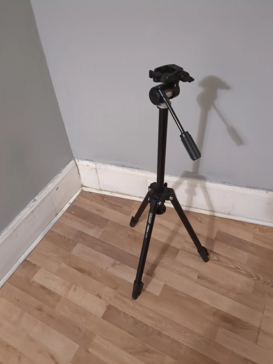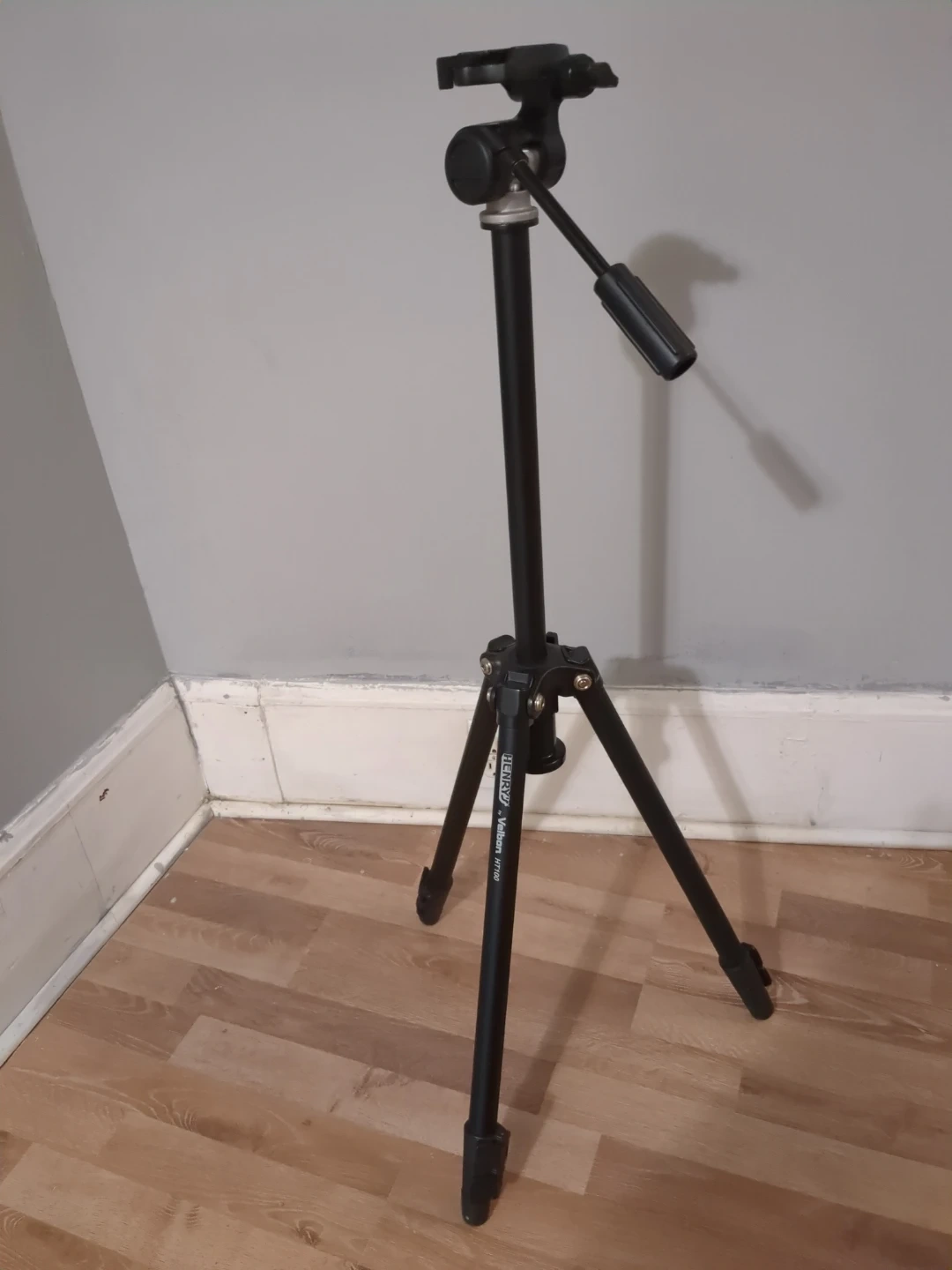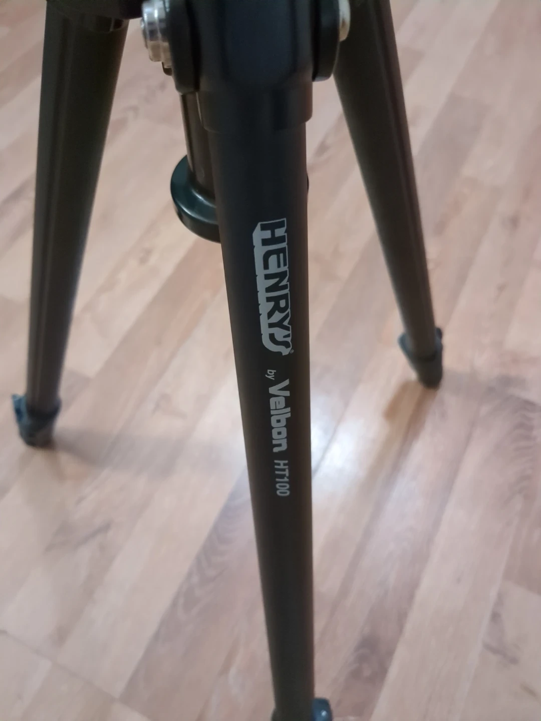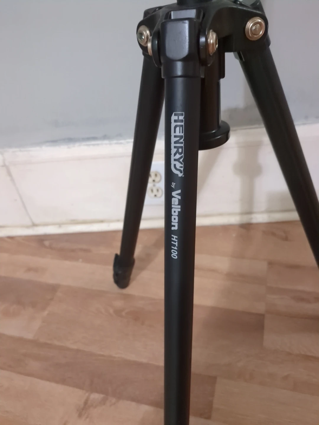 This is a Velbon HT100 Photo and Video Recorder Tripod distributed by Henry's. It's black with aluminum construction and lightweight. Pan Tilt Head, Features Quick Release Plate Latch/Lock for mounting cameras and telescopic leg sections.