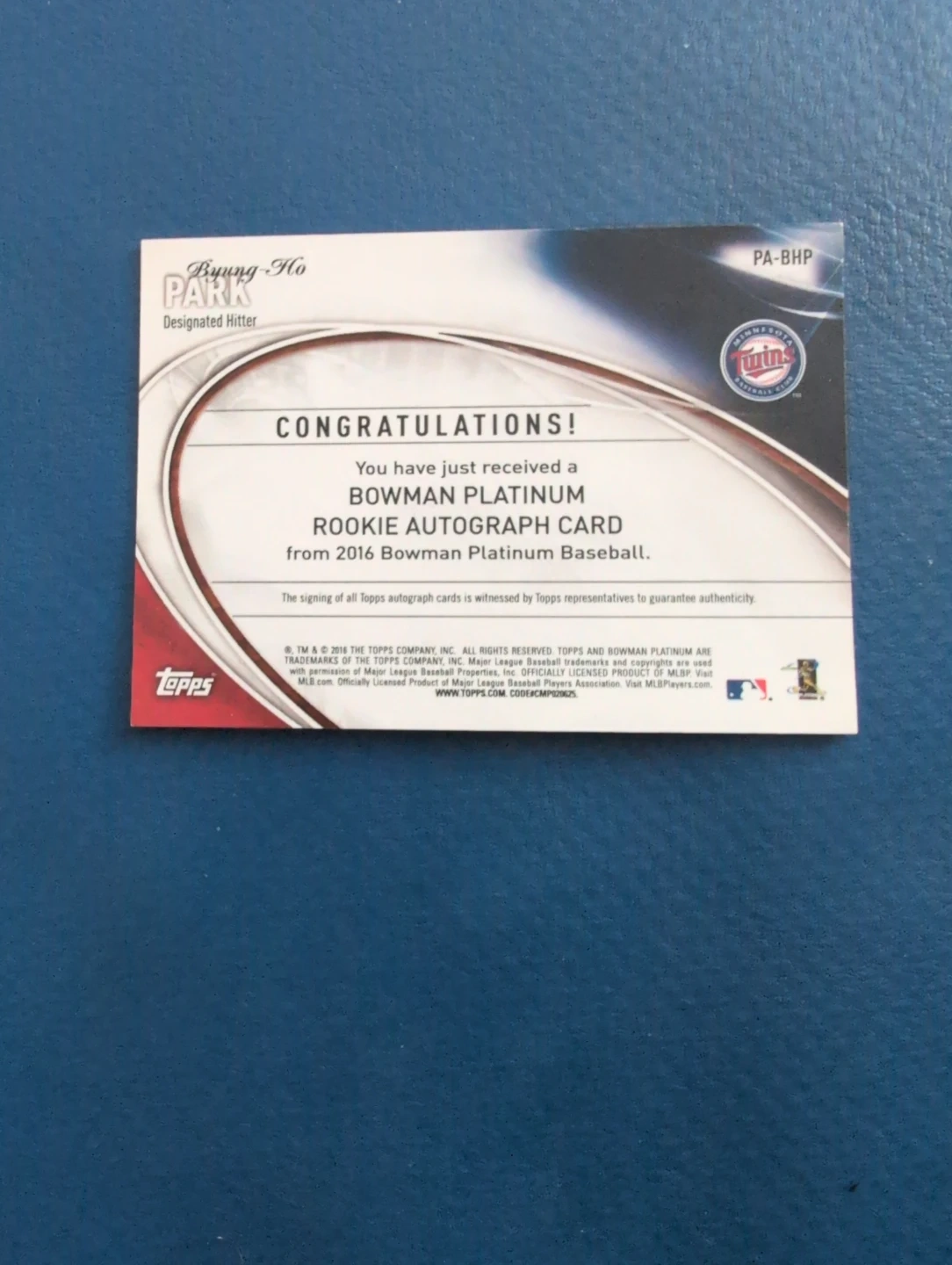 This is a 2016 Bowman Platinum Rookie Autograph card for Byung-Ho Park. It's a Topps Certified Autograph Issue and features his signature. The card commemorates his time with the Minnesota Twins.
