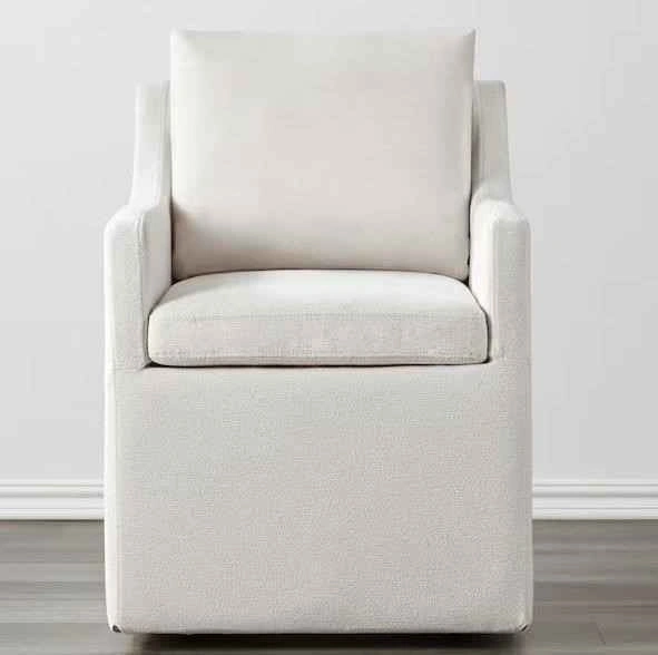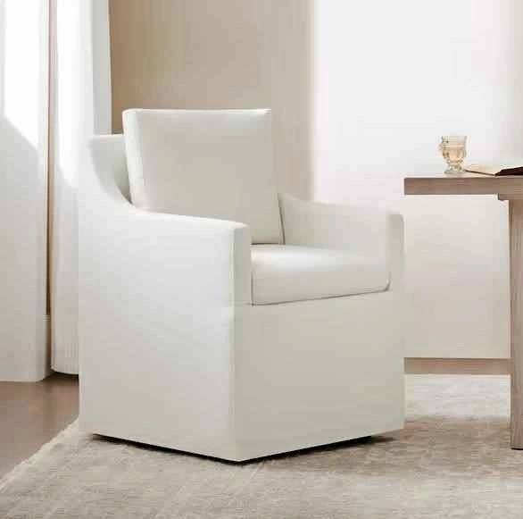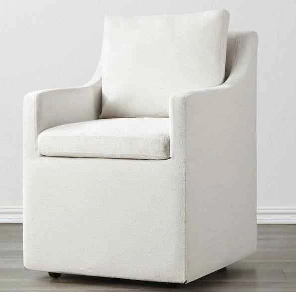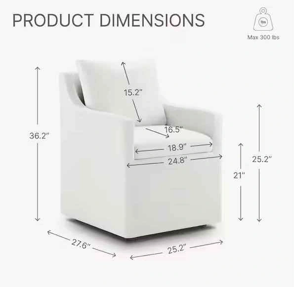 Stylish white fabric chair with a comfy cushion and removable casters. Great for dining room, bedroom, or living room. Dimensions are 36.2" tall, 27.6" wide, 25.2" deep. Seat height is 21". Needs to assemble.