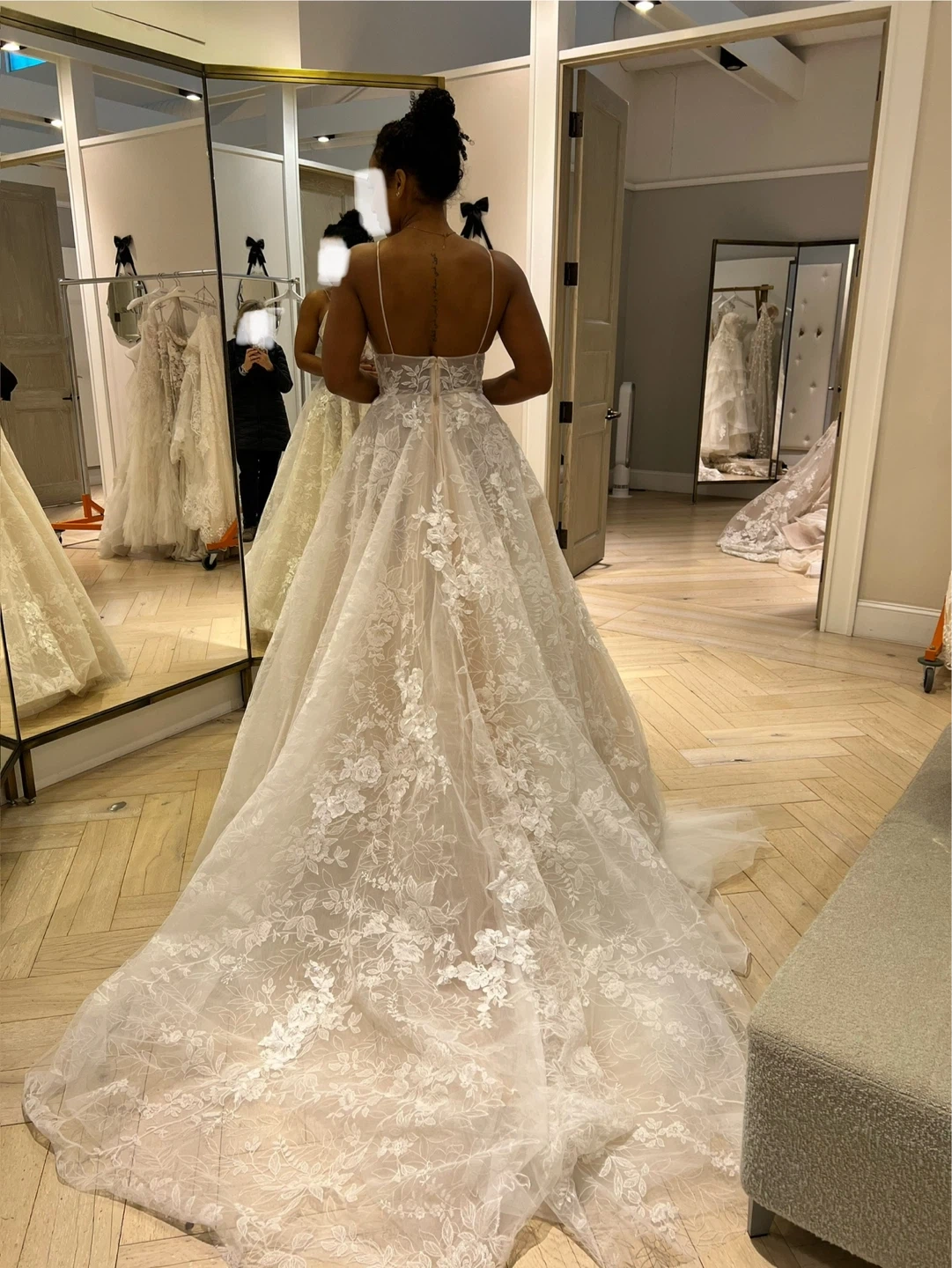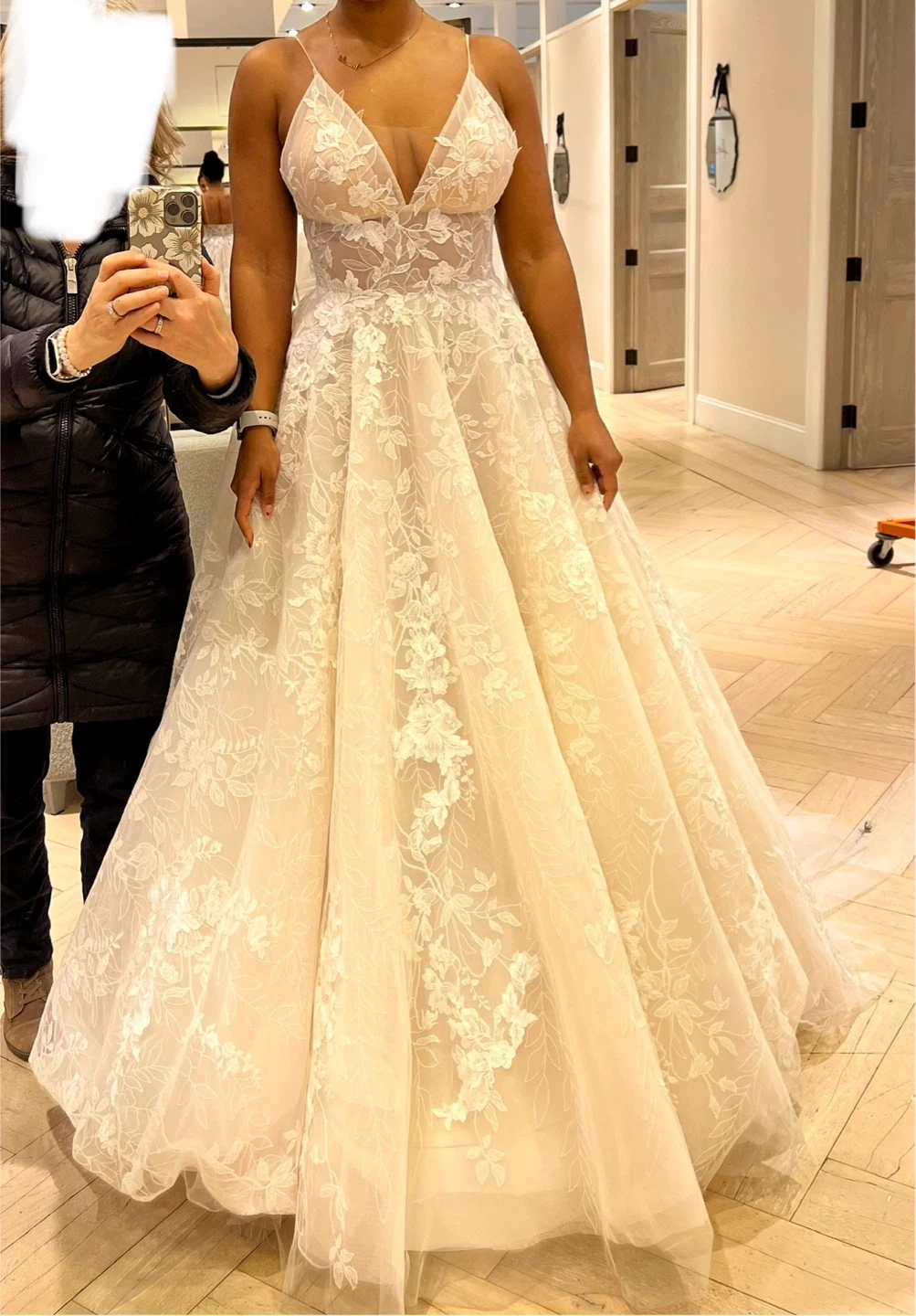 Gorgeous A-line wedding dress with intricate floral lace detailing all over. It features a plunging V-neckline and spaghetti straps with a beautiful train. This dress is perfect for a wedding ceremony!