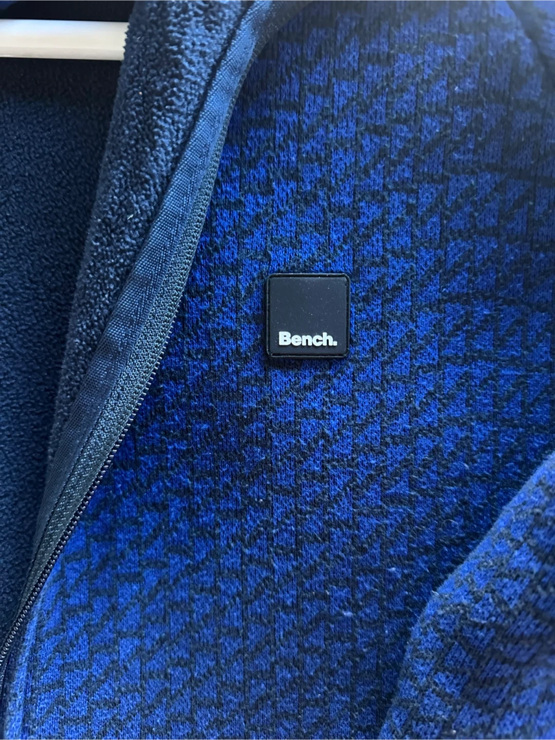 Bench hoodie in a cool blue patterned design! It's a size large and has a full zipper and hood, perfect for layering or wearing on its own