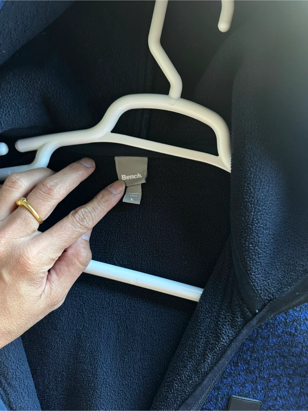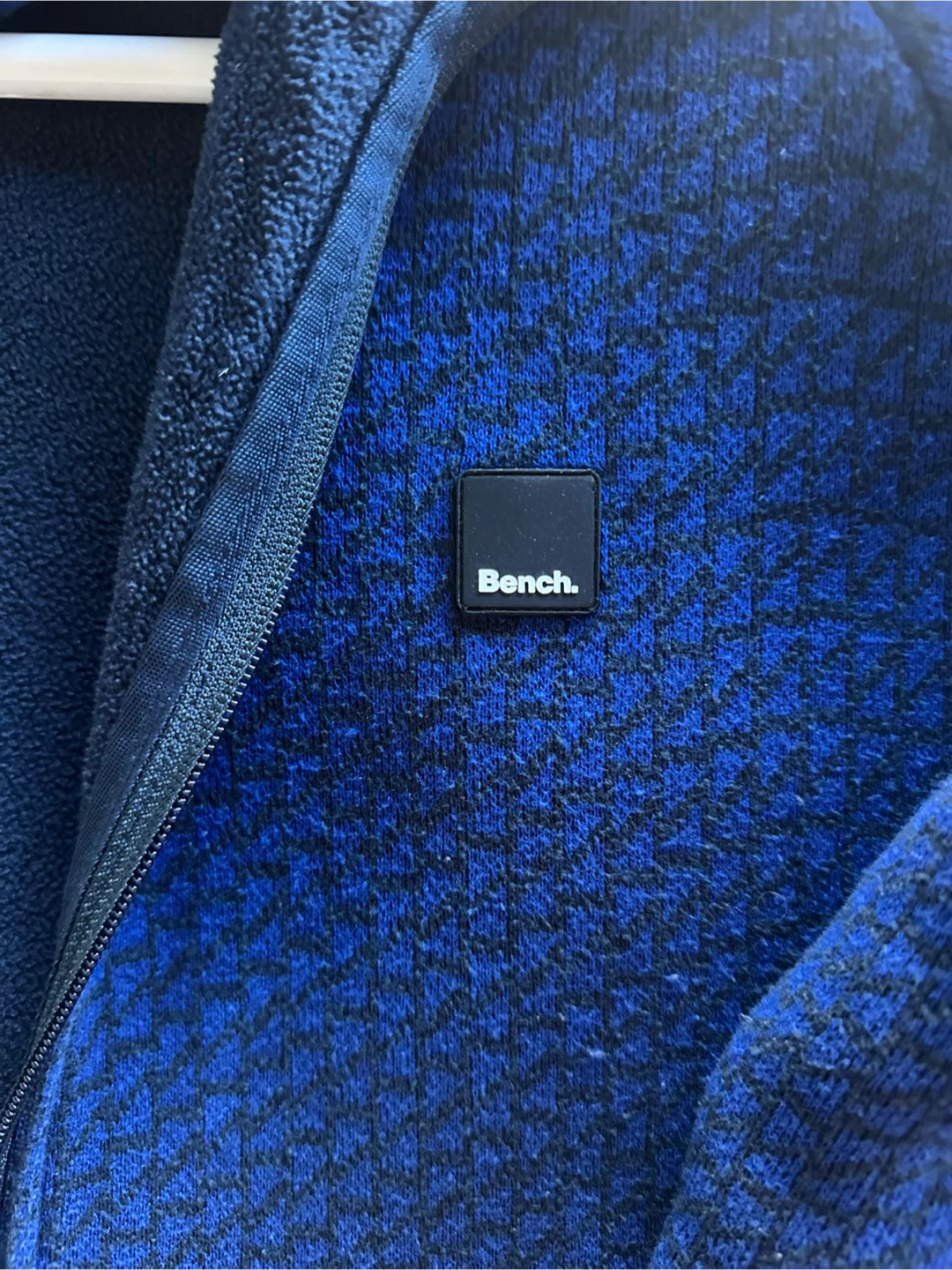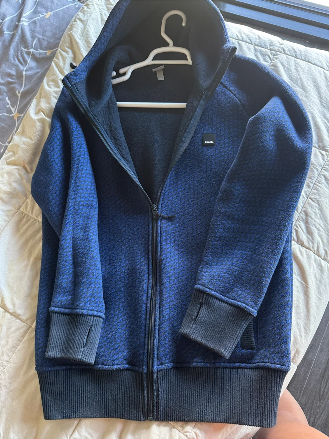Bench hoodie in a cool blue patterned design! It's a size large and has a full zipper and hood, perfect for layering or wearing on its own