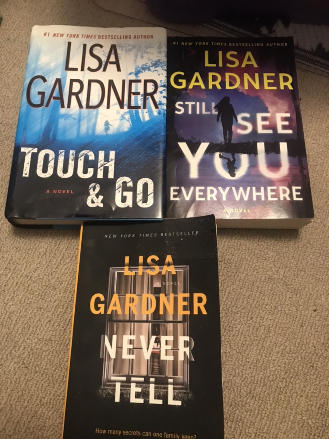 This is a lot of 7 paperback thriller novels by New York Times bestselling author Lisa Gardner. Books included are 'Touch & Go', 'Still See You Everywhere', 'Never Tell', 'Fear Nothing', 'The Neighbor', and 'Say Goodbye'. One book, 'Brandon's Bride', is written as Alicia Scott.