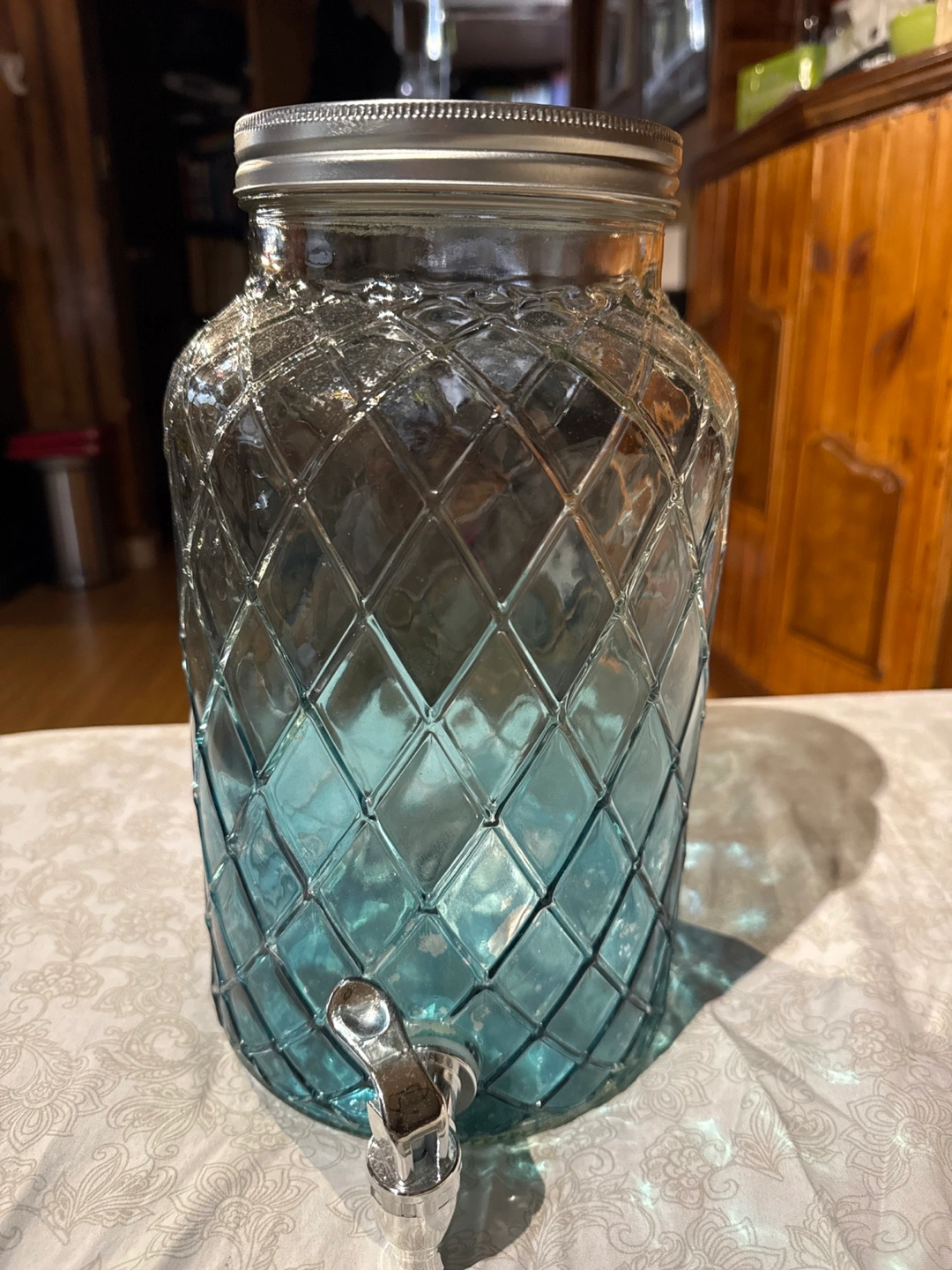 Beautiful blue glass beverage dispenser. Features a metal lid and spigot. Perfect for parties or everyday use. Diamond patterned glass.