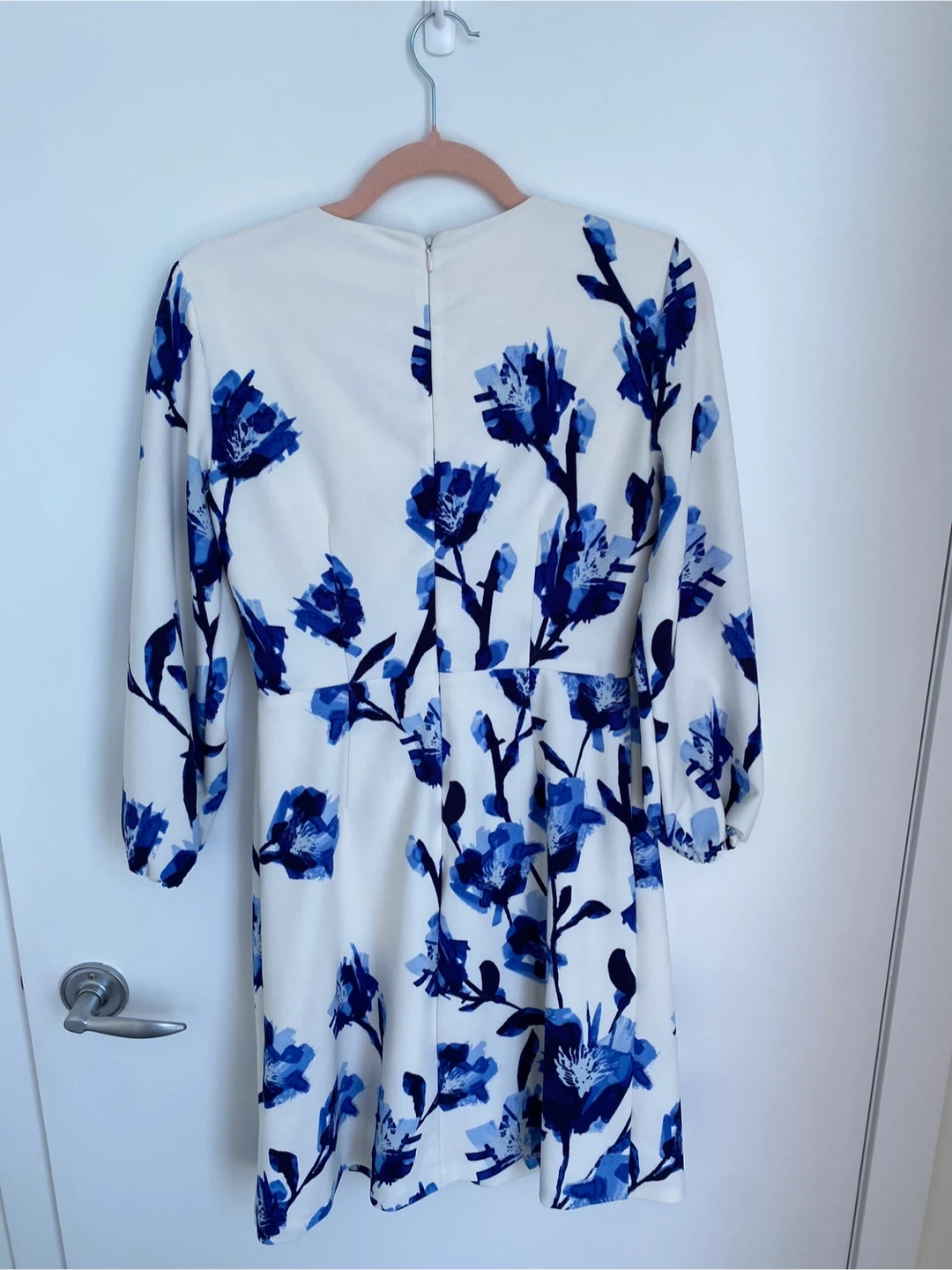 White Eliza dress with a blue floral print. It features a classic round neckline and three-quarter sleeves. This dress is perfect for a variety of occasions, from casual outings to more formal events.