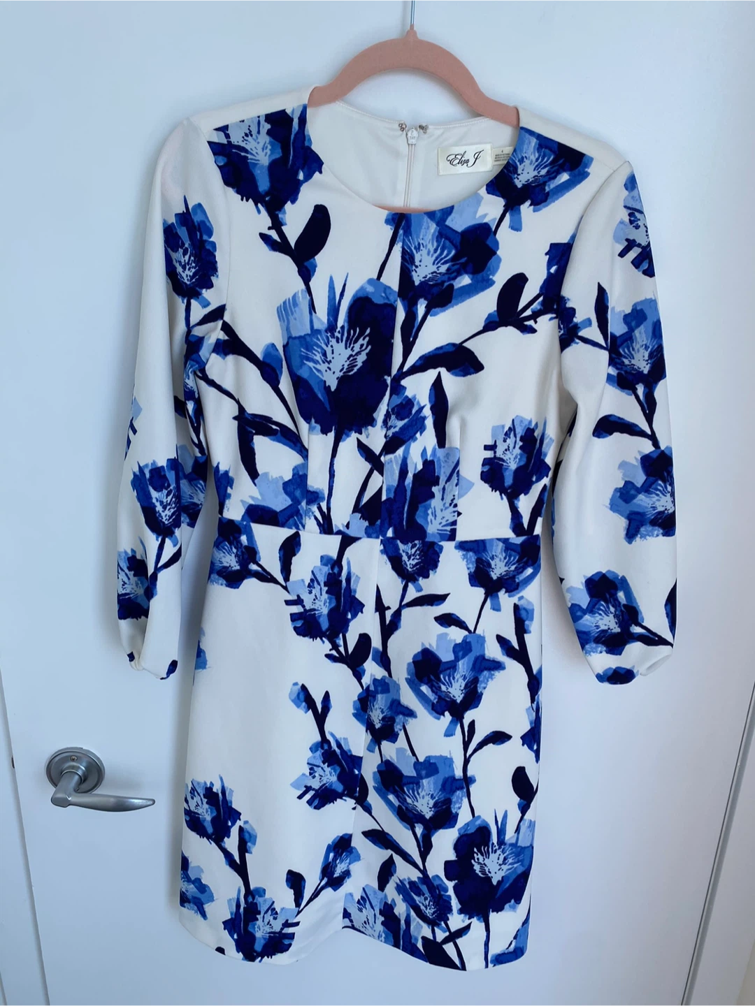 White Eliza dress with a blue floral print. It features a classic round neckline and three-quarter sleeves. This dress is perfect for a variety of occasions, from casual outings to more formal events.