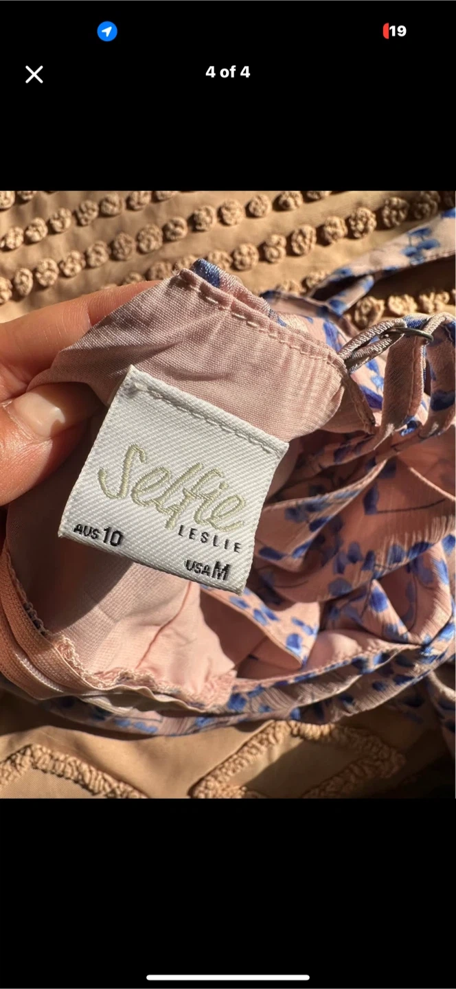This Selfie Leslie dress features a lovely floral print in pink and blue. It's a size AUS 10 or US Medium. The tiered ruffle skirt adds a playful touch to this summer mini dress.