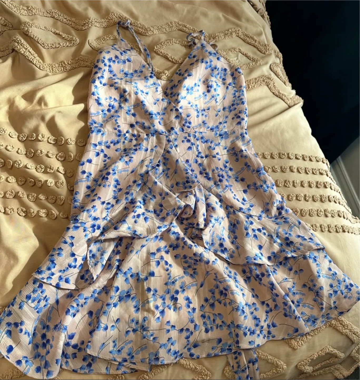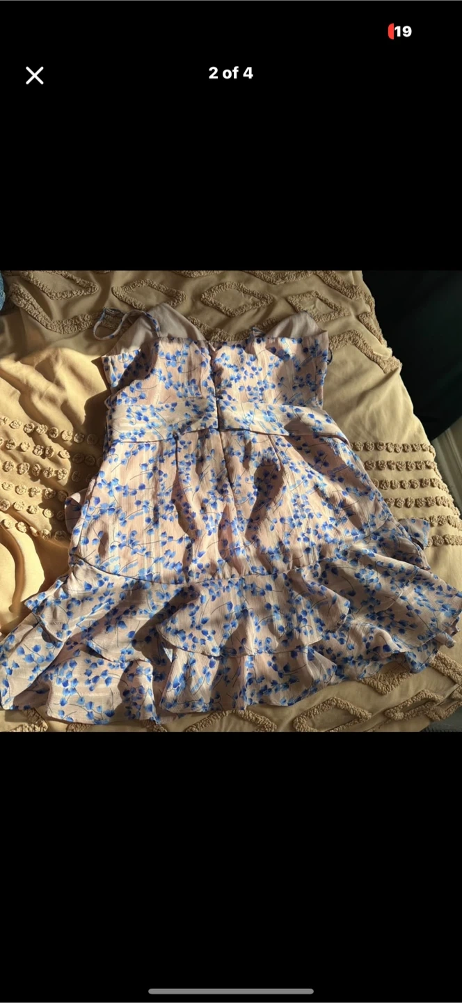 This Selfie Leslie dress features a lovely floral print in pink and blue. It's a size AUS 10 or US Medium. The tiered ruffle skirt adds a playful touch to this summer mini dress.