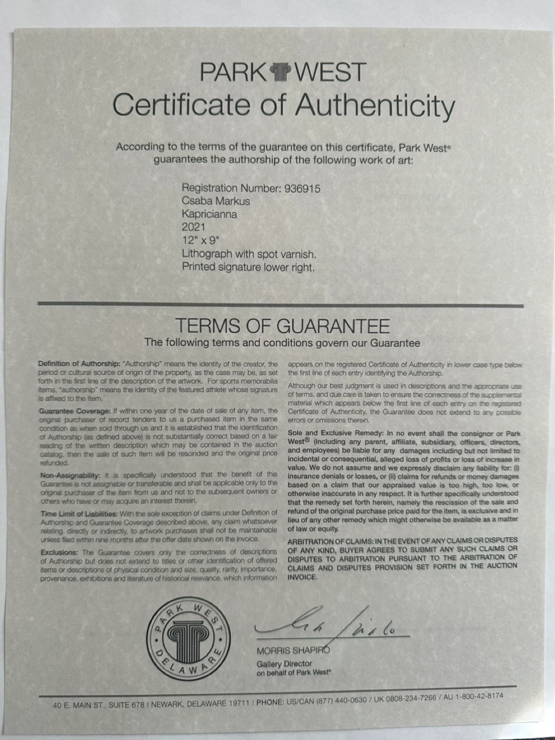 This is a "Kapricianna" lithograph by Csaba Markus, printed on fine art paper. The print measures 12" x 9" and features a vibrant portrait with spot varnish. It's hand-signed by the artist, Csaba Markus.