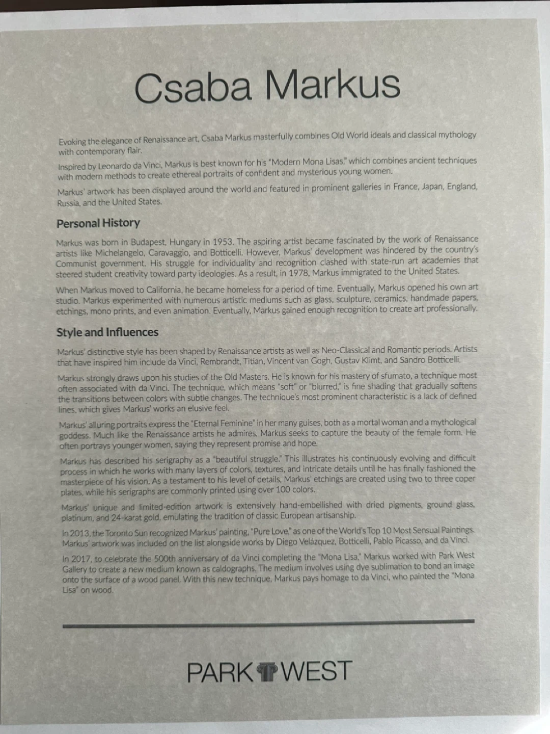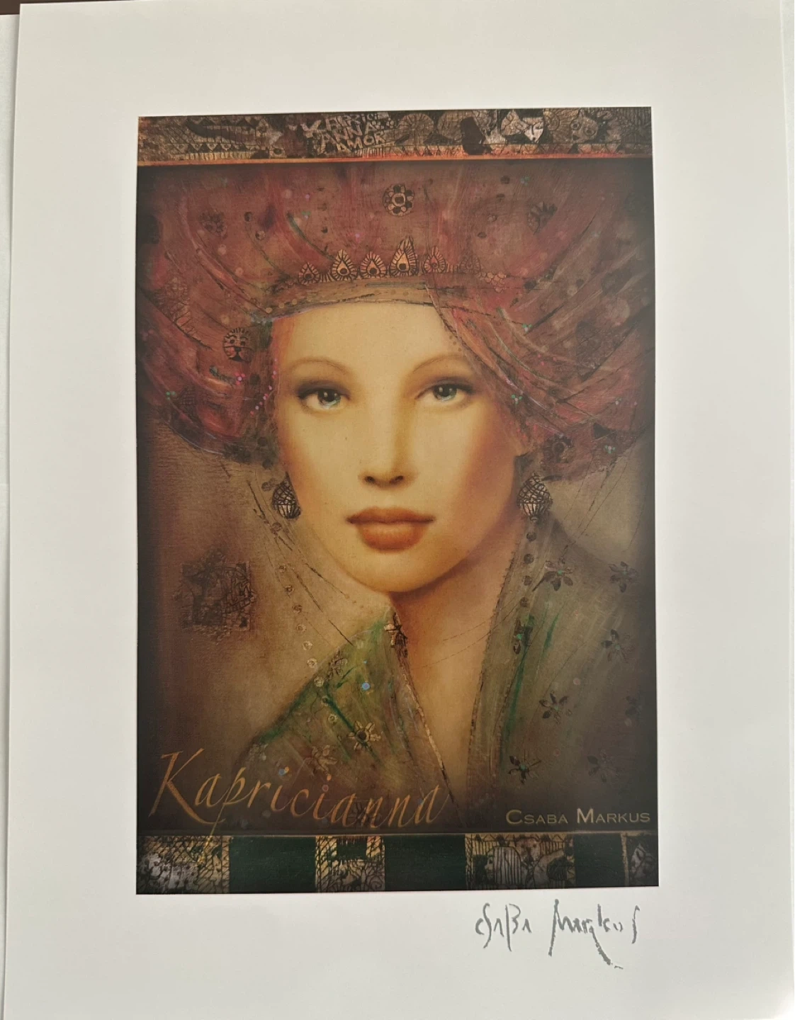This is a "Kapricianna" lithograph by Csaba Markus, printed on fine art paper. The print measures 12" x 9" and features a vibrant portrait with spot varnish. It's hand-signed by the artist, Csaba Markus.