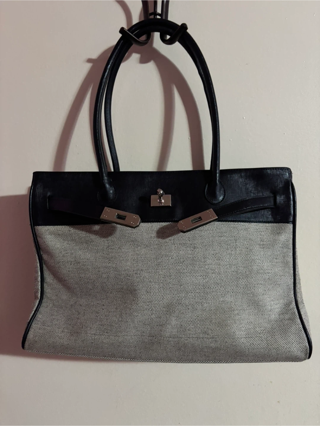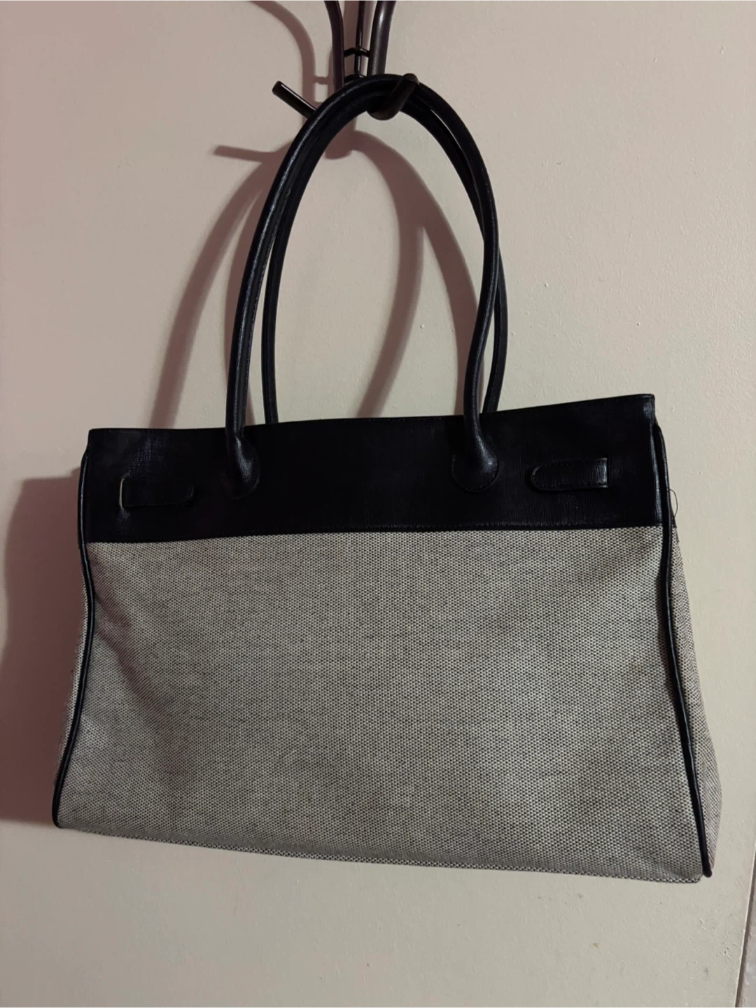 A chic tote handbag featuring black leather accents and a durable grey canvas body. It has silver-tone hardware and a secure clasp closure. This bag's classic design makes it suitable for everyday use.