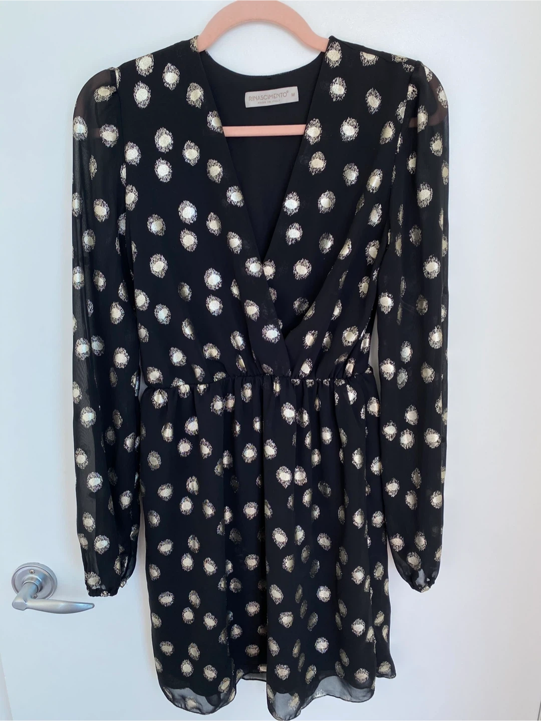 This Rinascimento dress features a black base with scattered gold polka dots. It's a stylish wrap-style dress with long sleeves. The material is lightweight and sheer, perfect for dressy occasions!