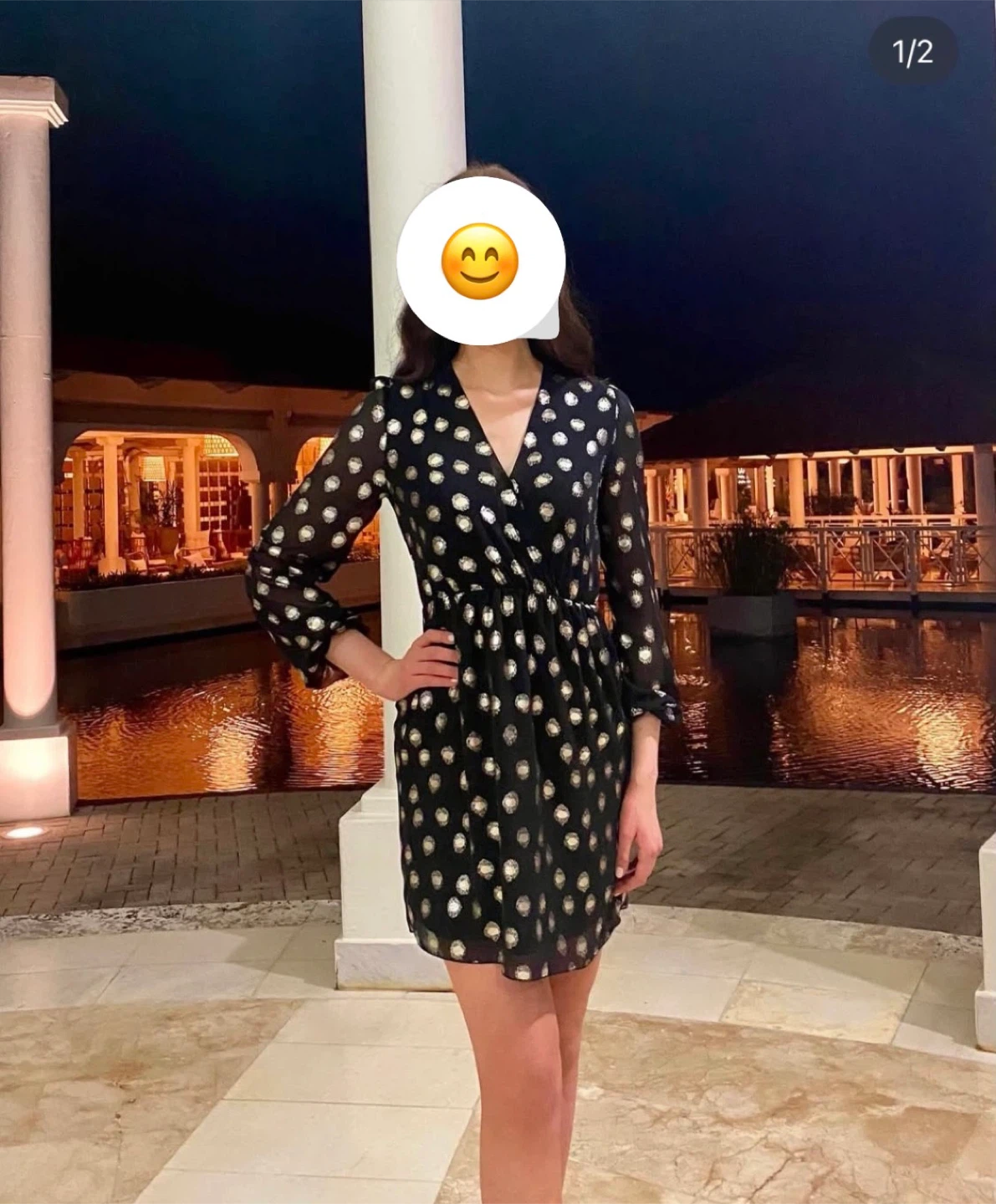 This Rinascimento dress features a black base with scattered gold polka dots. It's a stylish wrap-style dress with long sleeves. The material is lightweight and sheer, perfect for dressy occasions!