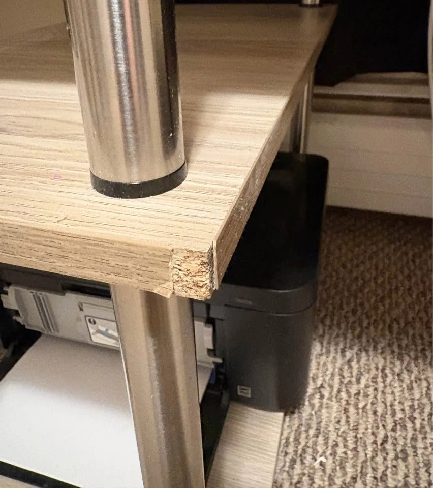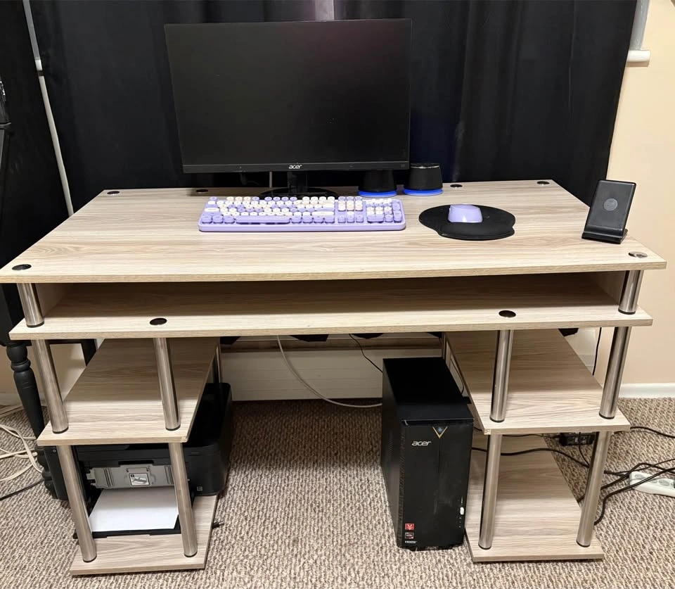 Selling this oak office desk. Measurements shown in photos. Originally from Amazon. Lots of shelf space and storage. Back panels need to be pressed back into place and some minor wear and tear as shown in the photos. Smoke free/ pet free home. Must be able to pick up and bring down stairs.
