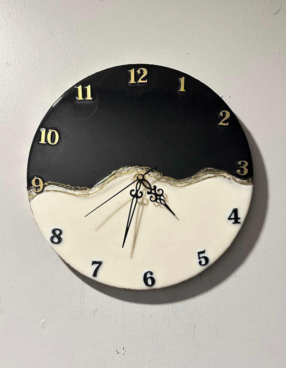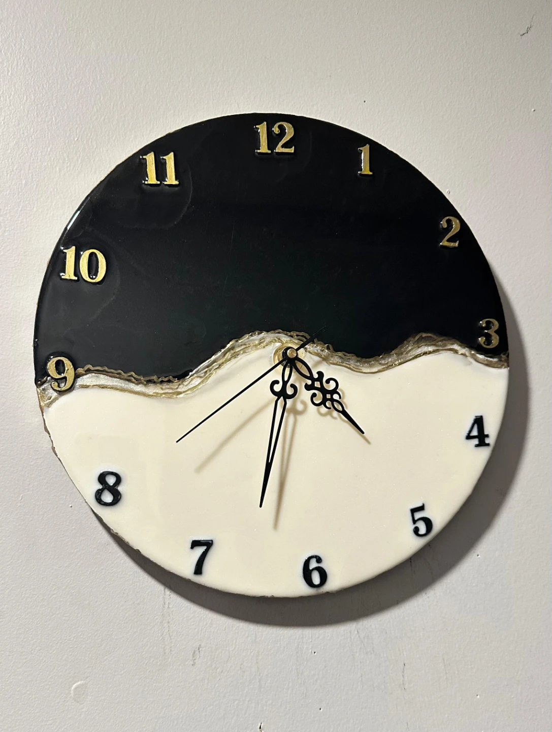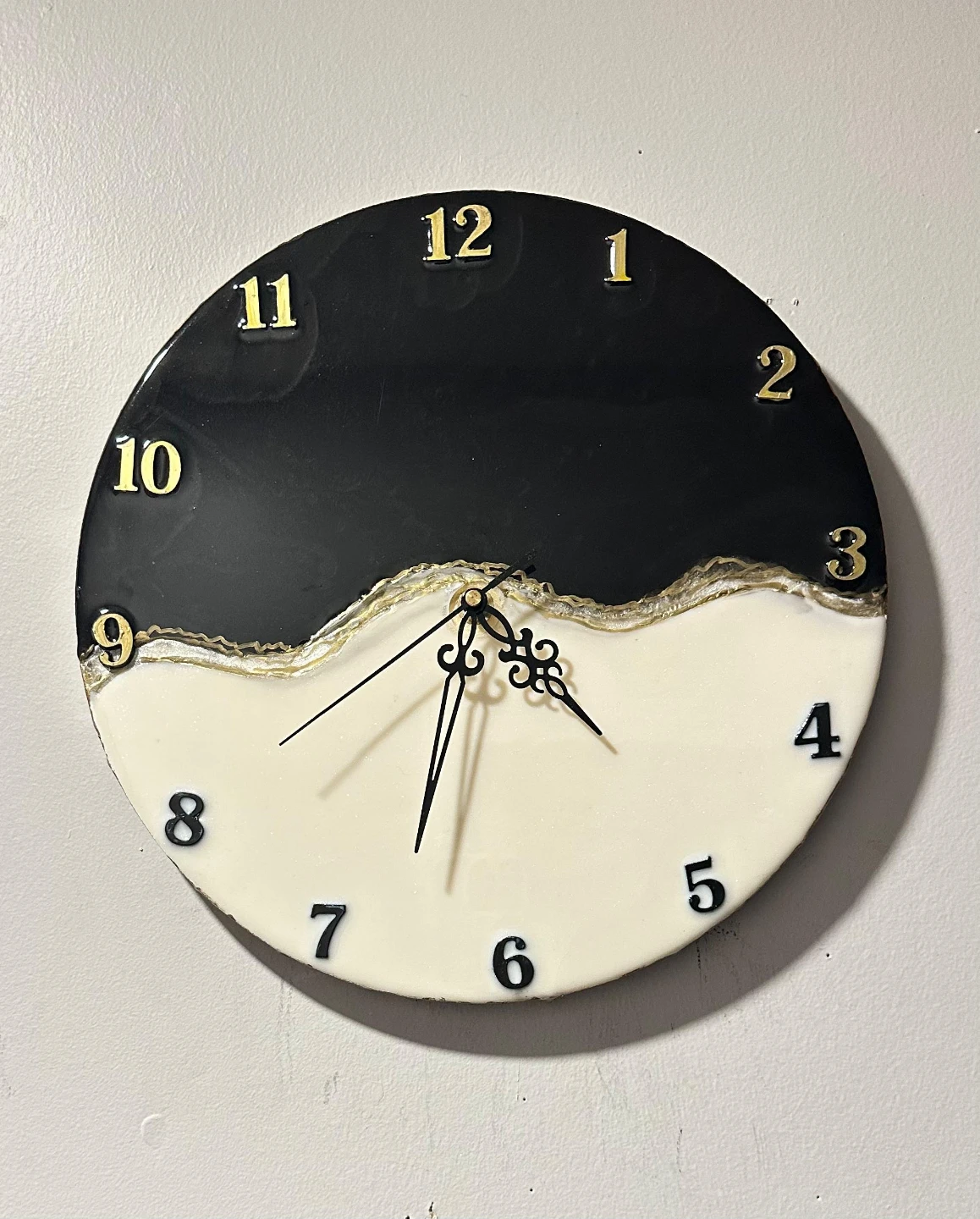 Selling this beautiful black and white resin wall clock. It's in great condition and would look lovely in any room! The gold numbers add a touch of elegance