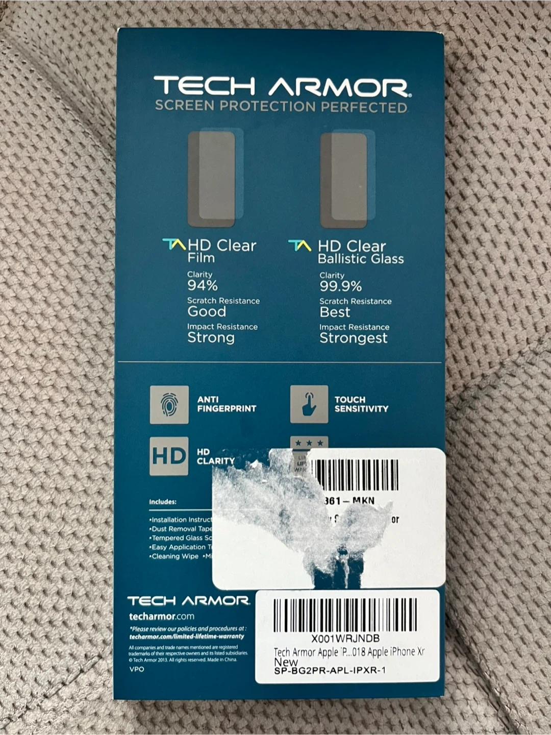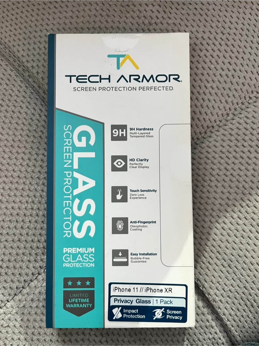This is a Tech Armor privacy glass screen protector designed for the iPhone 11 or iPhone XR. It offers 9H hardness and HD clarity with touch sensitivity. Includes oleophobic coating for anti-fingerprint protection.