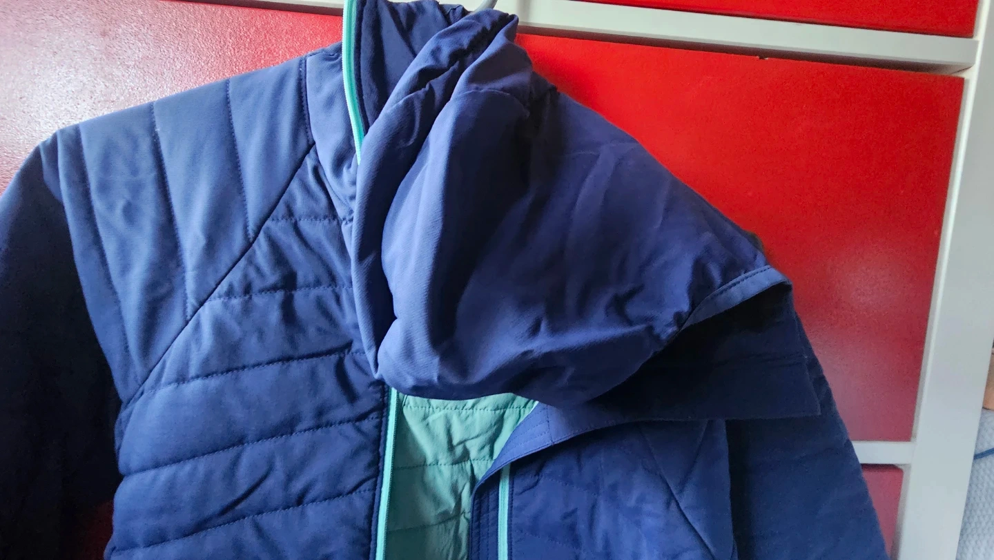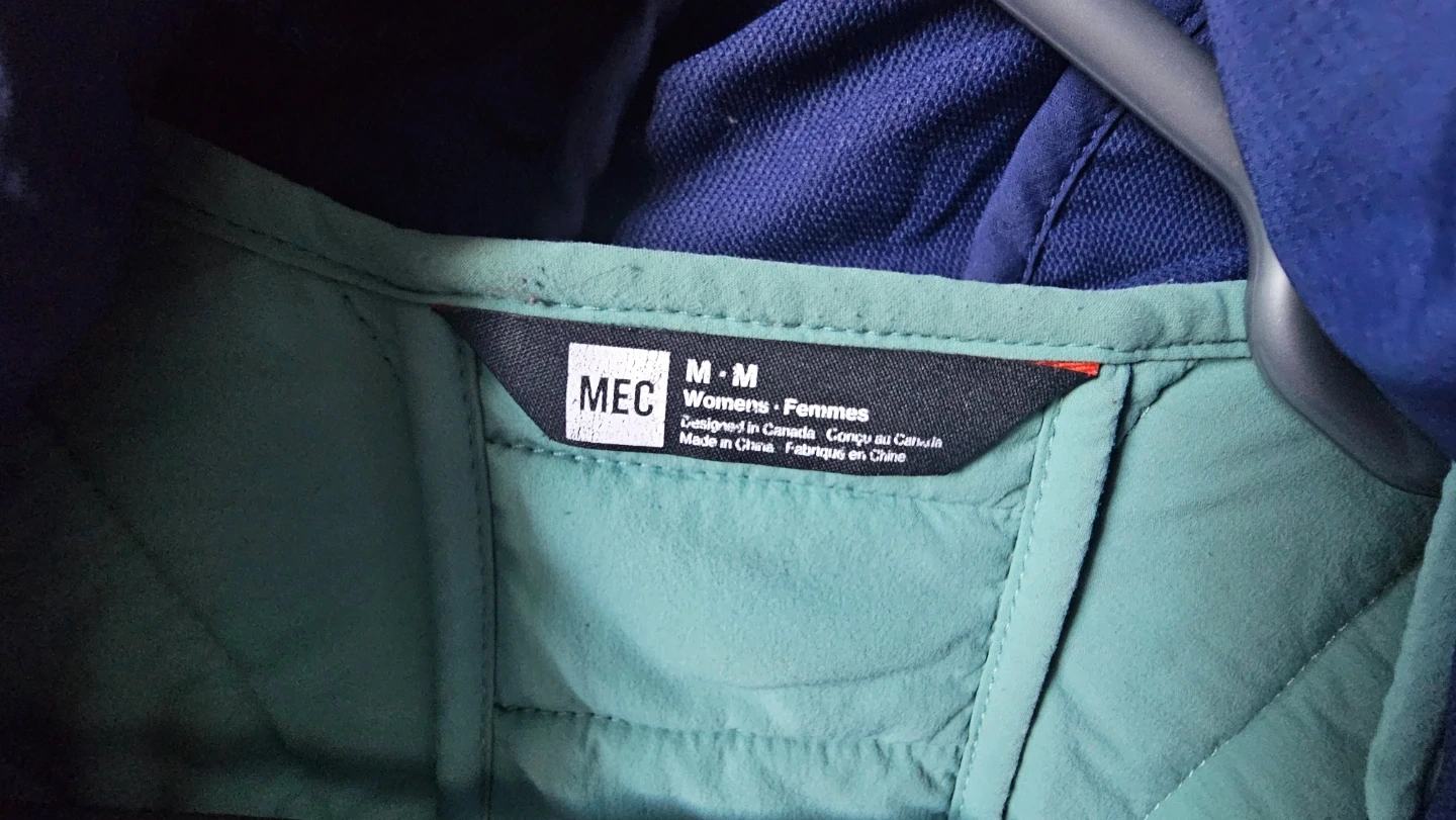 This MEC puffer jacket is designed in Canada and made in China. It's a women's size medium with a blue exterior and a green interior. The jacket has a hood and quilted detailing.