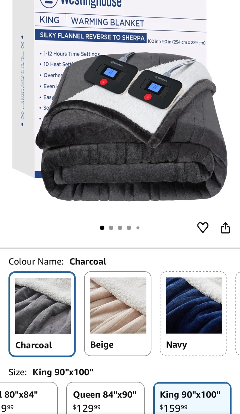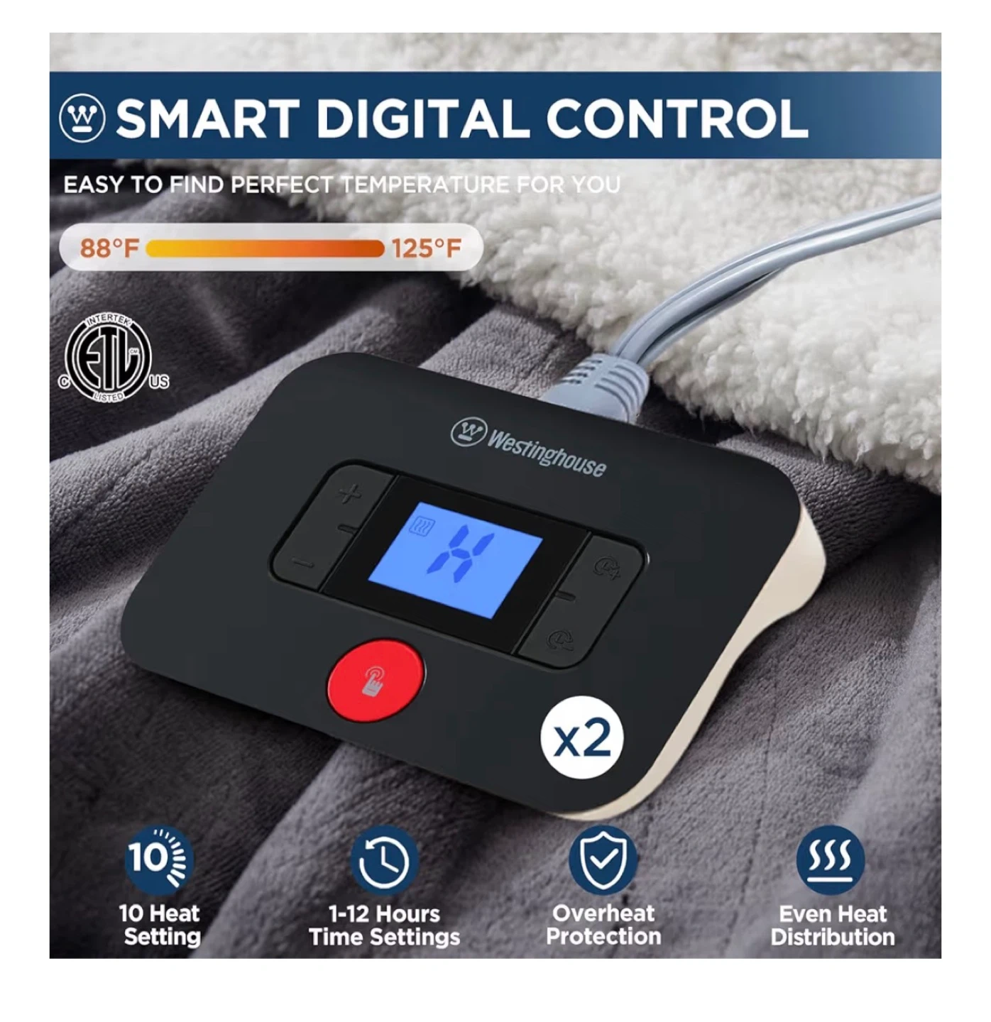 This Westinghouse warming blanket is 100in x 90in with a silky flannel reverse to sherpa. It offers 10 heat settings and 1-12 hours of time settings. Overheat protection is included for safety.