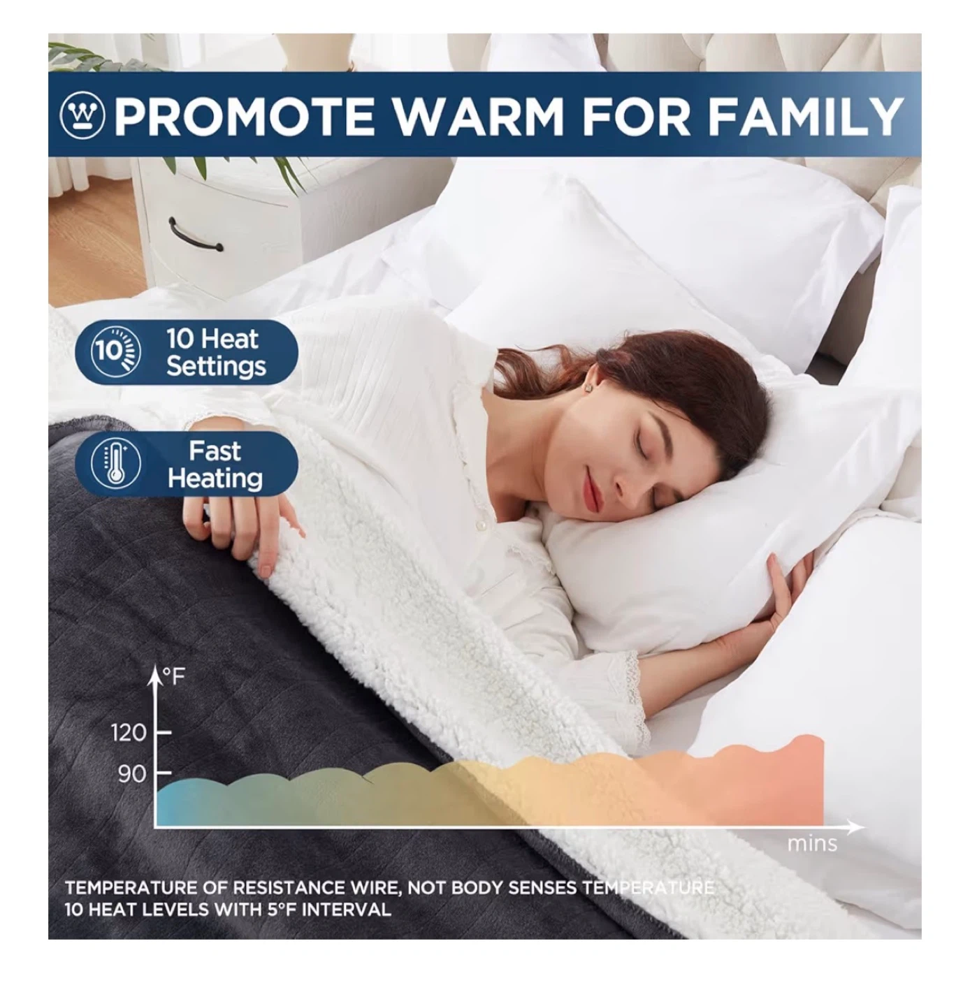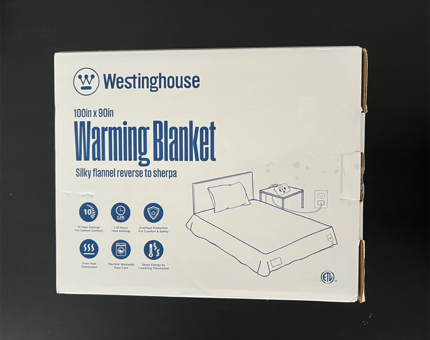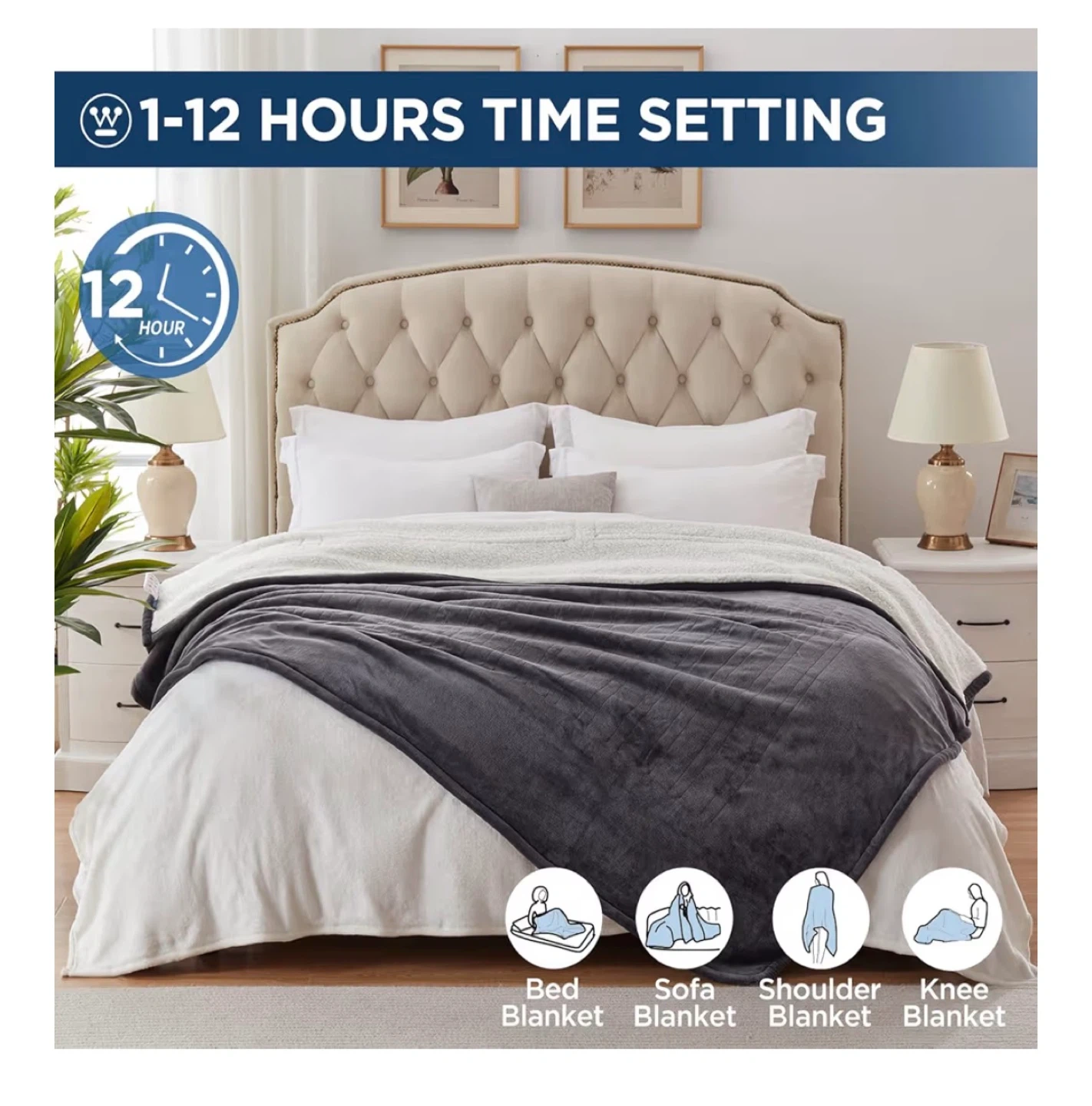 This Westinghouse warming blanket is 100in x 90in with a silky flannel reverse to sherpa. It offers 10 heat settings and 1-12 hours of time settings. Overheat protection is included for safety.