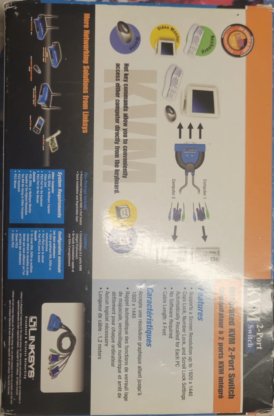 Selling a Linksys Integrated KVM 2-Port Switch. It supports screen resolution up to 1920 x 1440 and has Caps Lock, Number Lock, and Scroll Lock settings automatically registered for each PC. No software is required. Cable length is 4 feet. The box is included!