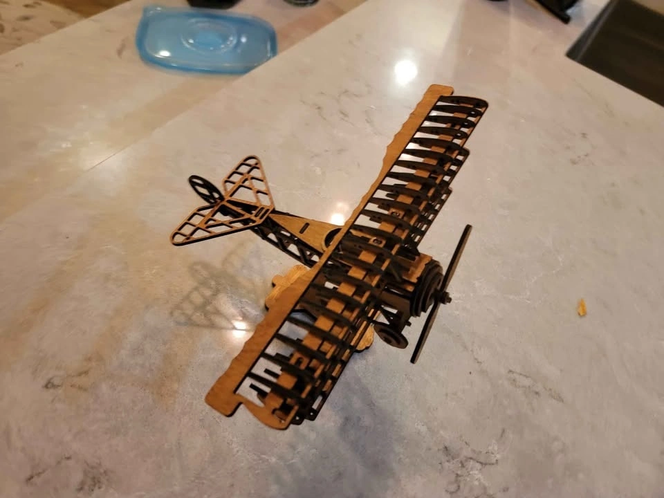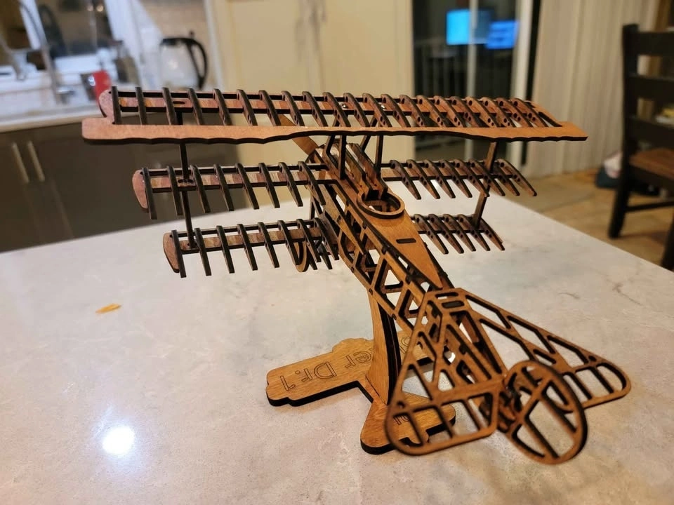 This is a laser-cut wooden model I made of Baron Manfred Von Richthofen's famous "flying circus" Triplane. It's inspired by the aircraft in which he achieved many of his famous World War One victories. While it could be covered and painted red, I personally like the natural wood look. You can purchase it fully assembled or as a kit with easy-to-follow instructions. The price is the same for either option. Custom orders are available with or without stain, color, or custom engraving, though these may require additional time. Please note that I will ignore messages asking if it's still available. I accept cash, E-Transfer, debit, and credit card payments in person. You can see other items I build here: https://timothyflath.smugmug.com/Personal/Laser-Cutting-Engraving-Products