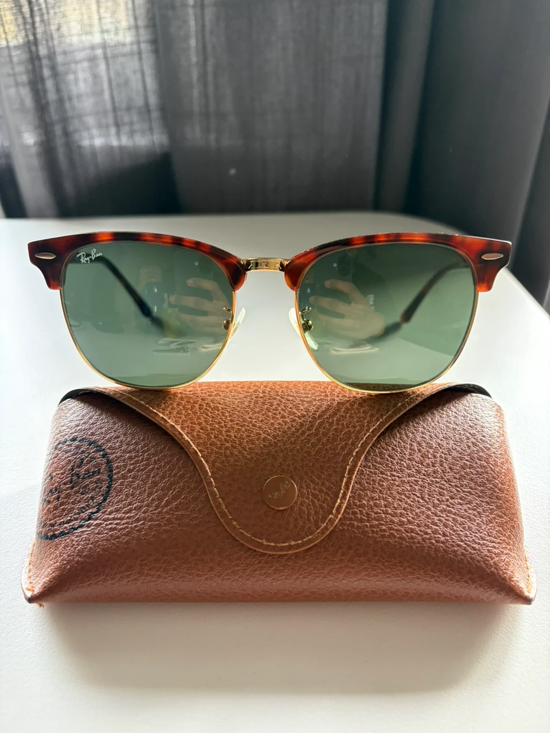 Ray-Ban Clubmaster sunglasses in a tortoiseshell pattern. Model RB 3016F W0366 51 19 145 3N. Includes original brown leather case. Classic style for everyday wear!
