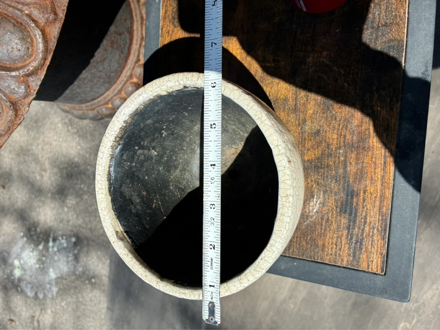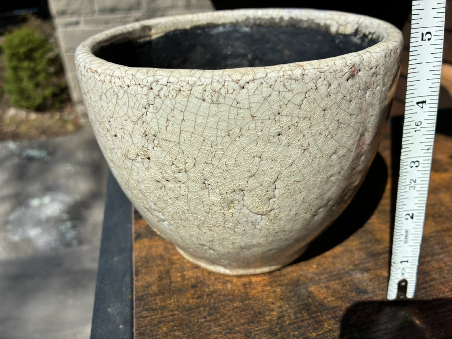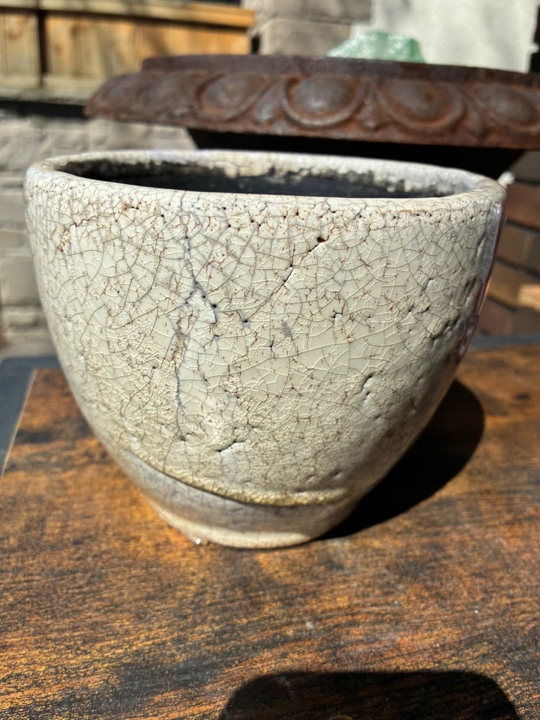 This is is a uniquely glazed mottled raku pot Has hole in bottom