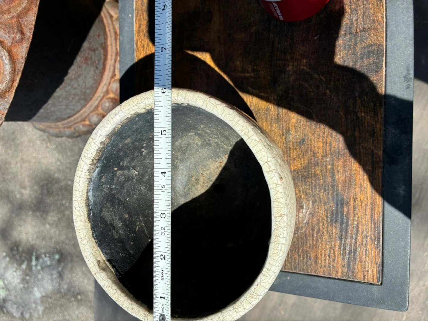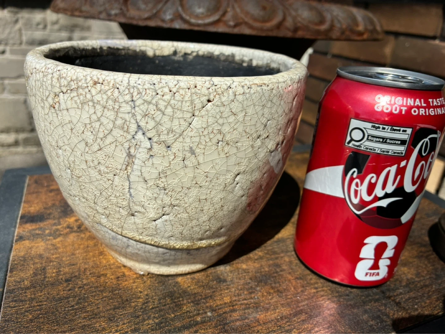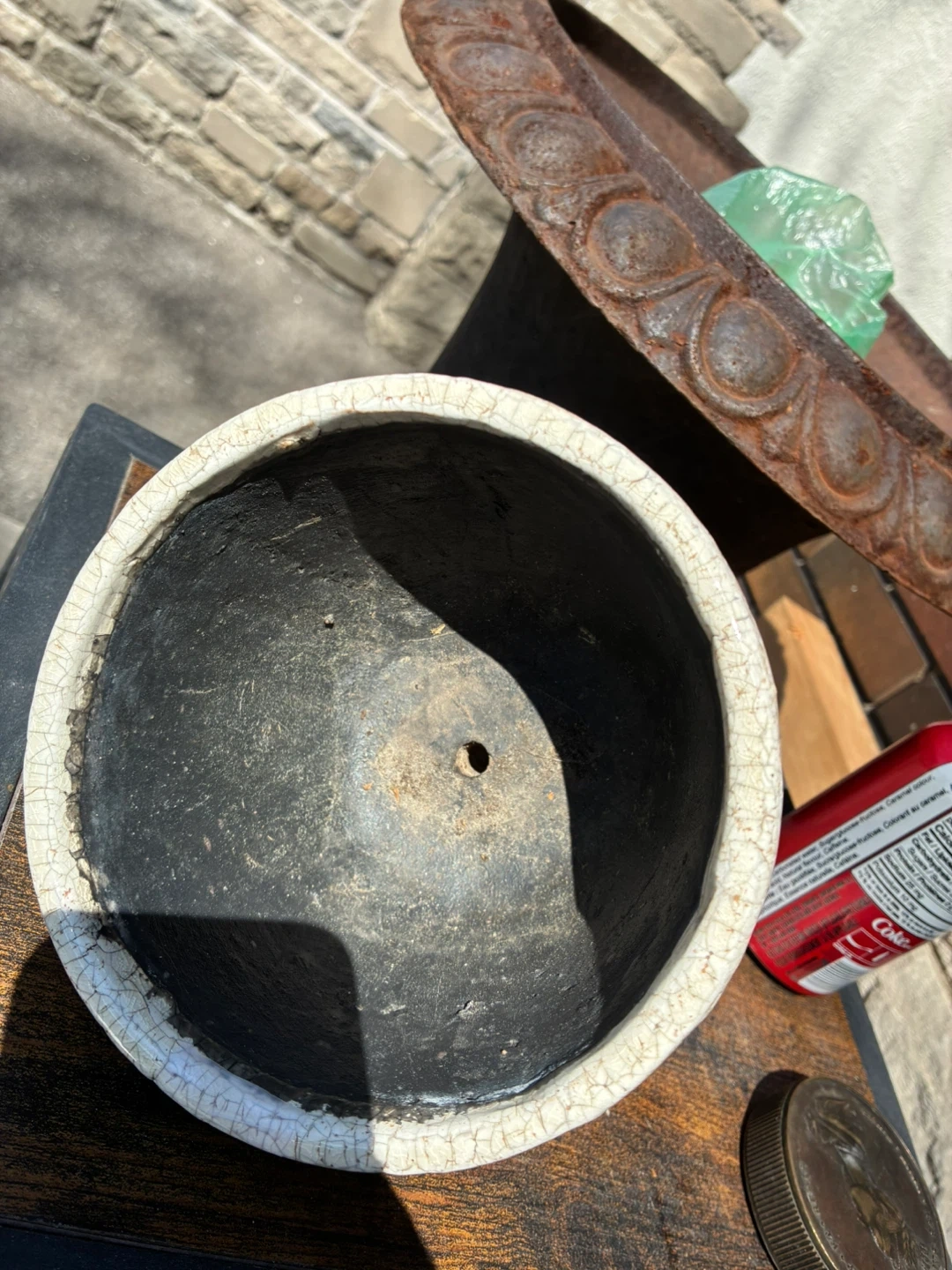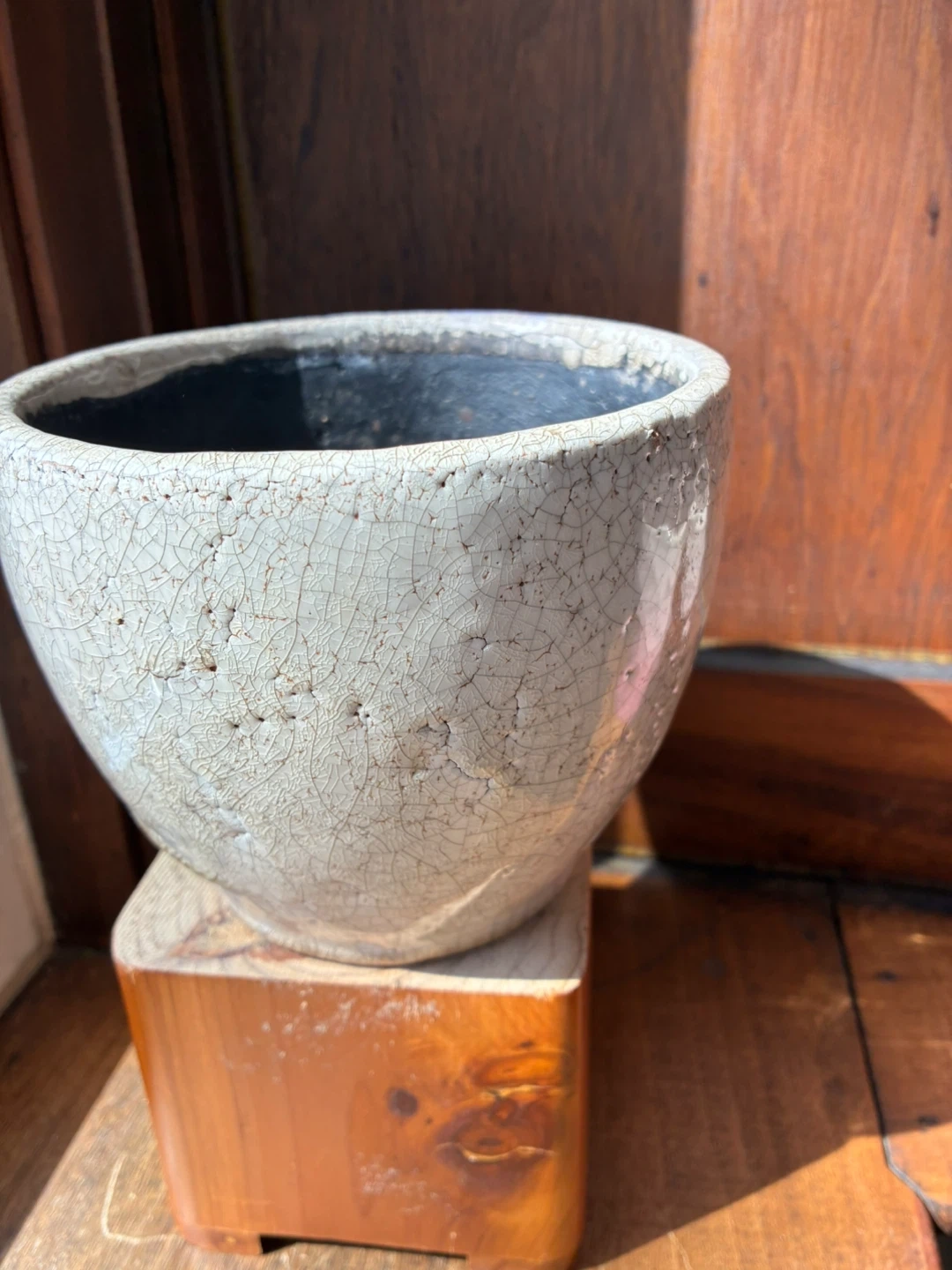 This is is a uniquely glazed mottled raku pot Has hole in bottom