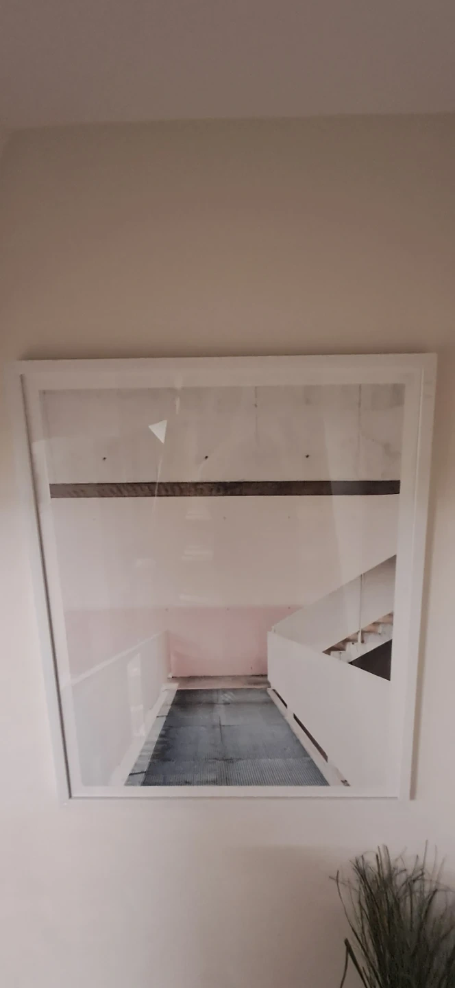 This is a framed art print featuring a modern staircase design. It's housed in a clean white frame. The print's dimensions are roughly 24 inches by 36 inches.
