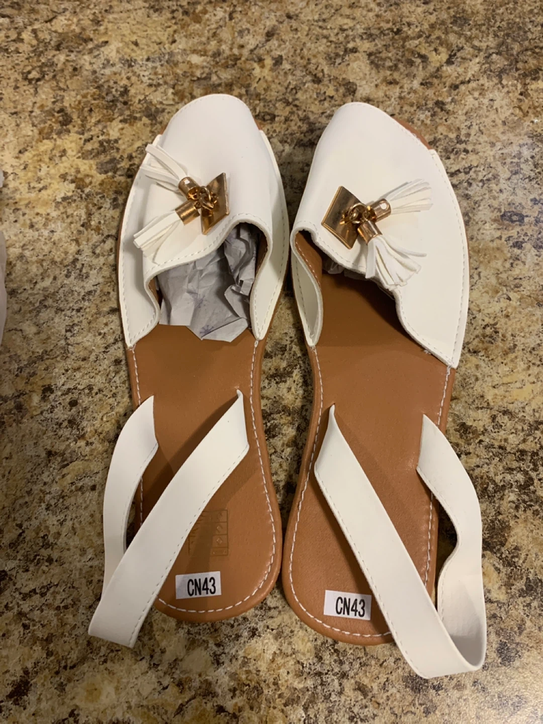 Comfortable white flat sandals featuring a stylish tassel and gold-tone detail on the vamp. The open-toe design and strap provide a secure fit. Perfect for everyday wear or casual outings!
