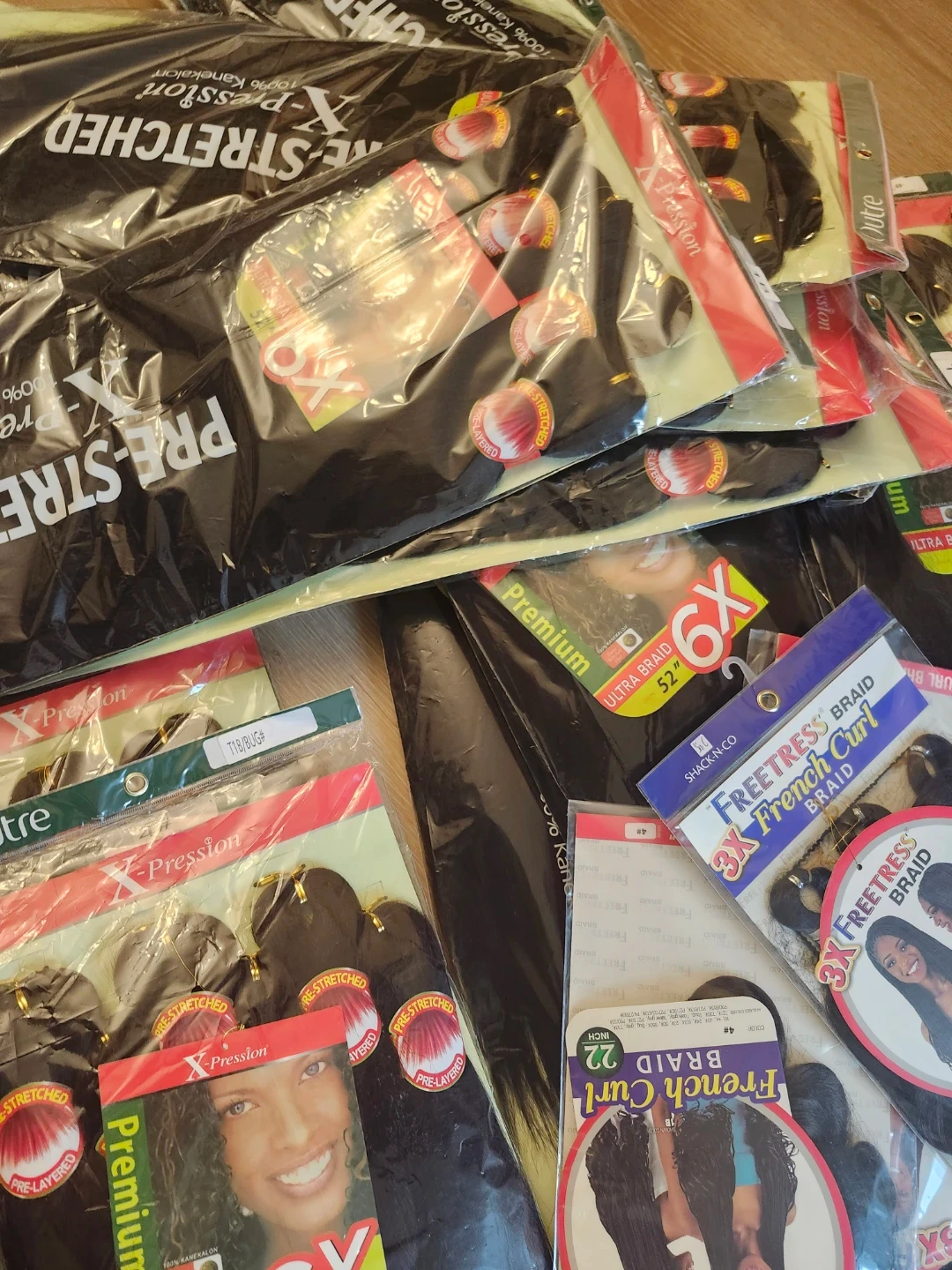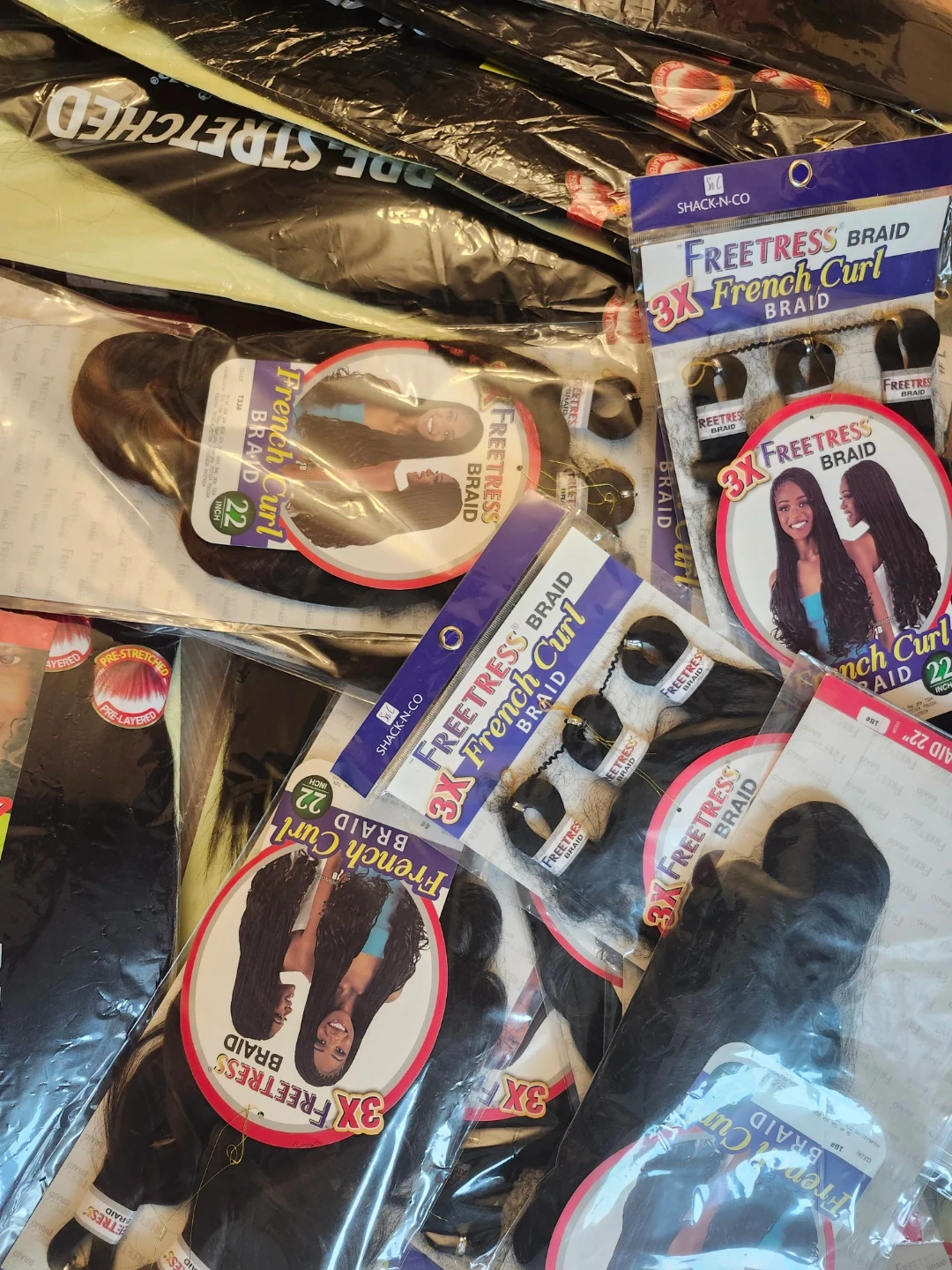 Assortment of Freetress 3X French Curl Braids and X-Pression Pre-Stretched Ultra Braid hair. Multiple packs included, some are 22" and others are 52". Available in various colours.