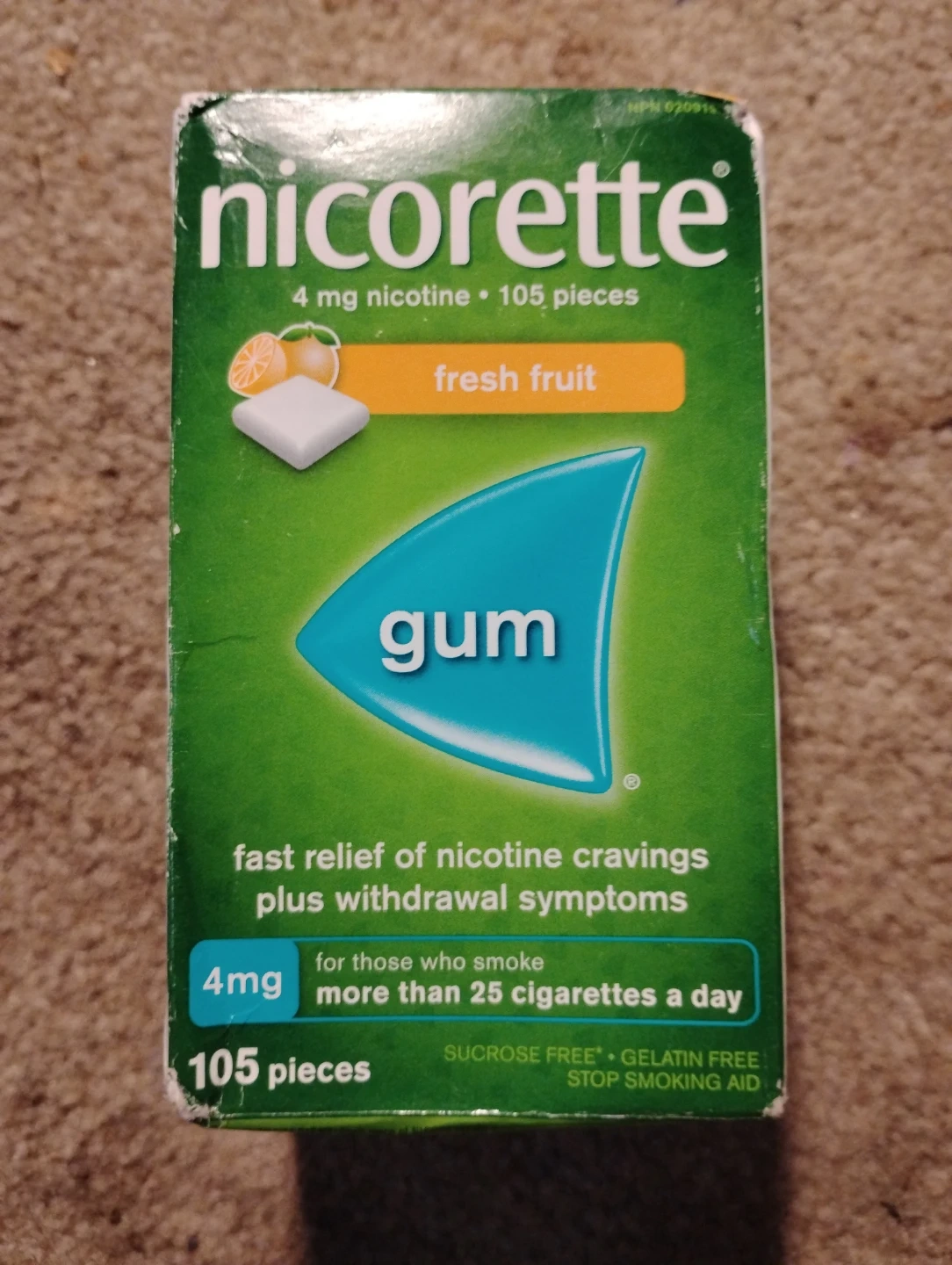 Nicorette gum offers fast relief from nicotine cravings and withdrawal symptoms. It's a fresh fruit flavour and comes in 4mg strength. This pack contains 105 pieces and is sucrose and gelatin-free. It's designed as a stop smoking aid.