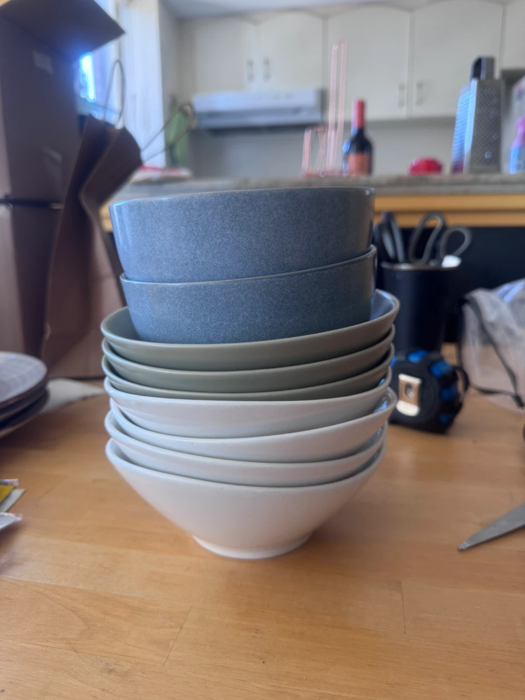 Selling a set of 8 bowls in varying colours. Includes 2 grey, 2 sage green, and 4 white bowls. They're perfect for everyday use at the dinner table. They’re on the smaller side, perfect for soups or snacks