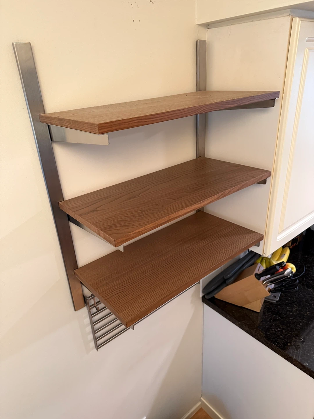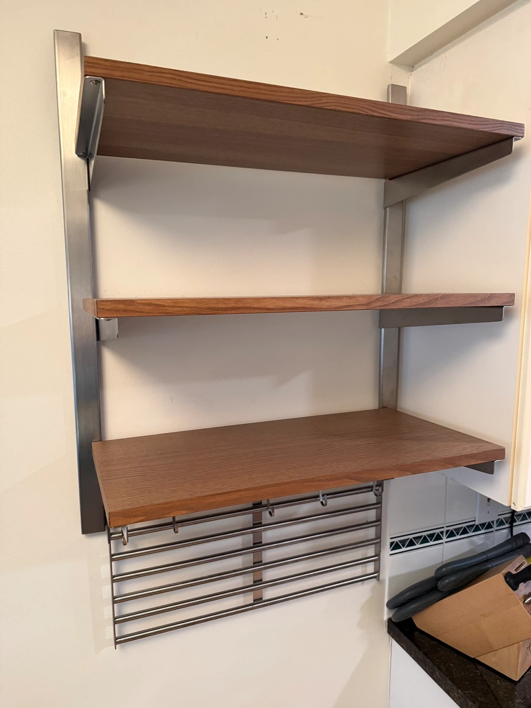 Selling an IKEA KUNGSFORS suspension rail with shelves, stainless steel and ash. Also includes a KUNGSFORS wall rack in stainless steel. Great for adding some extra storage to your kitchen or workspace