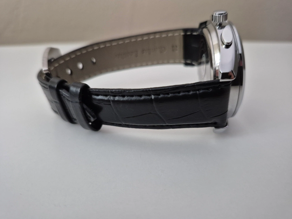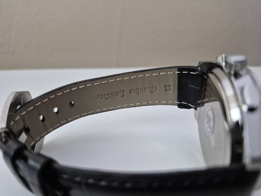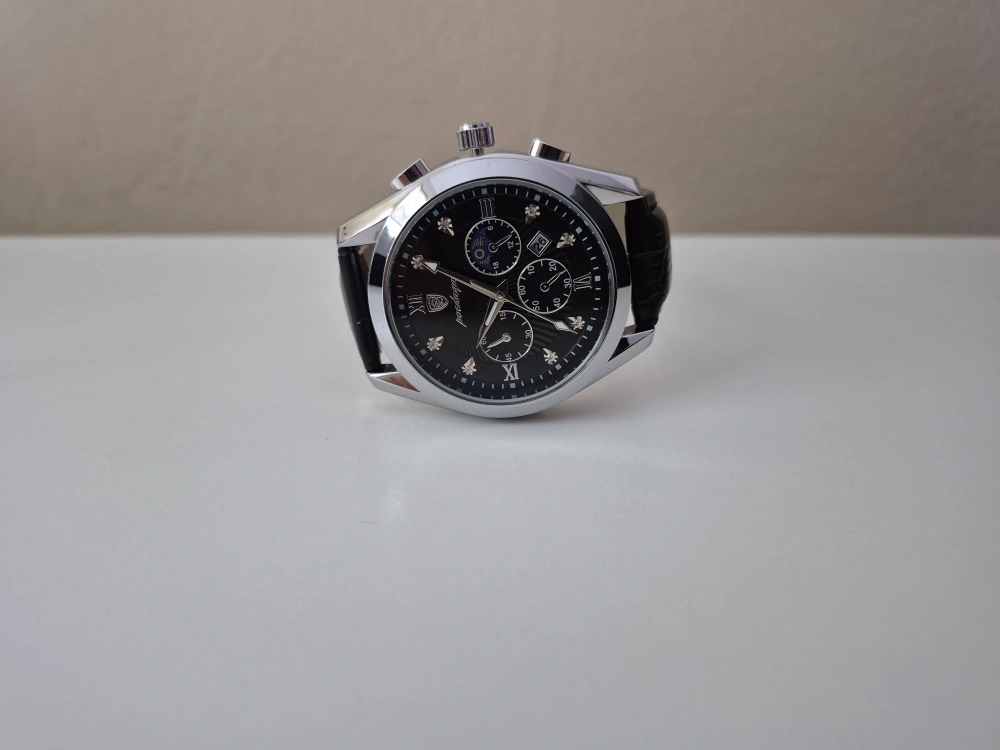 Elegant men's wristwatch. genuine leather band. Silver-toned casing, black face. Looks great and keeps accurate time.