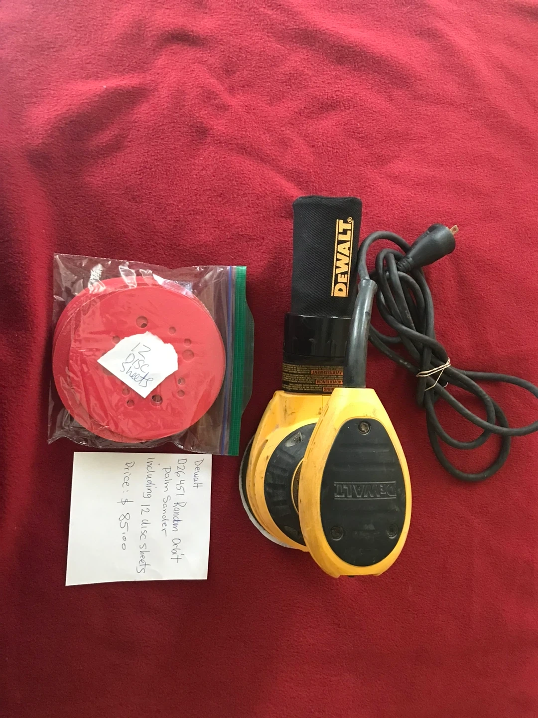DeWalt D26451 Random Orbit Palm Sander is a yellow and black electric power tool. It comes with a dust collection bag and 12 unused sanding sheets. This sander is great for a variety of DIY and woodworking projects.
