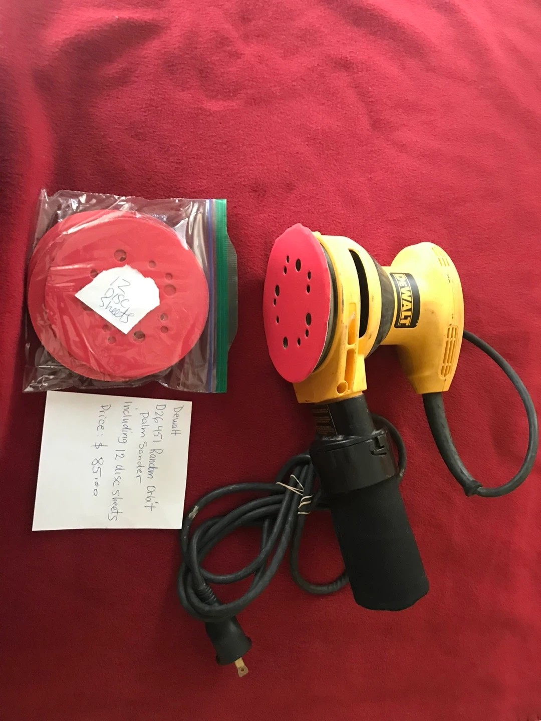 DeWalt D26451 Random Orbit Palm Sander is a yellow and black electric power tool. It comes with a dust collection bag and 12 unused sanding sheets. This sander is great for a variety of DIY and woodworking projects.