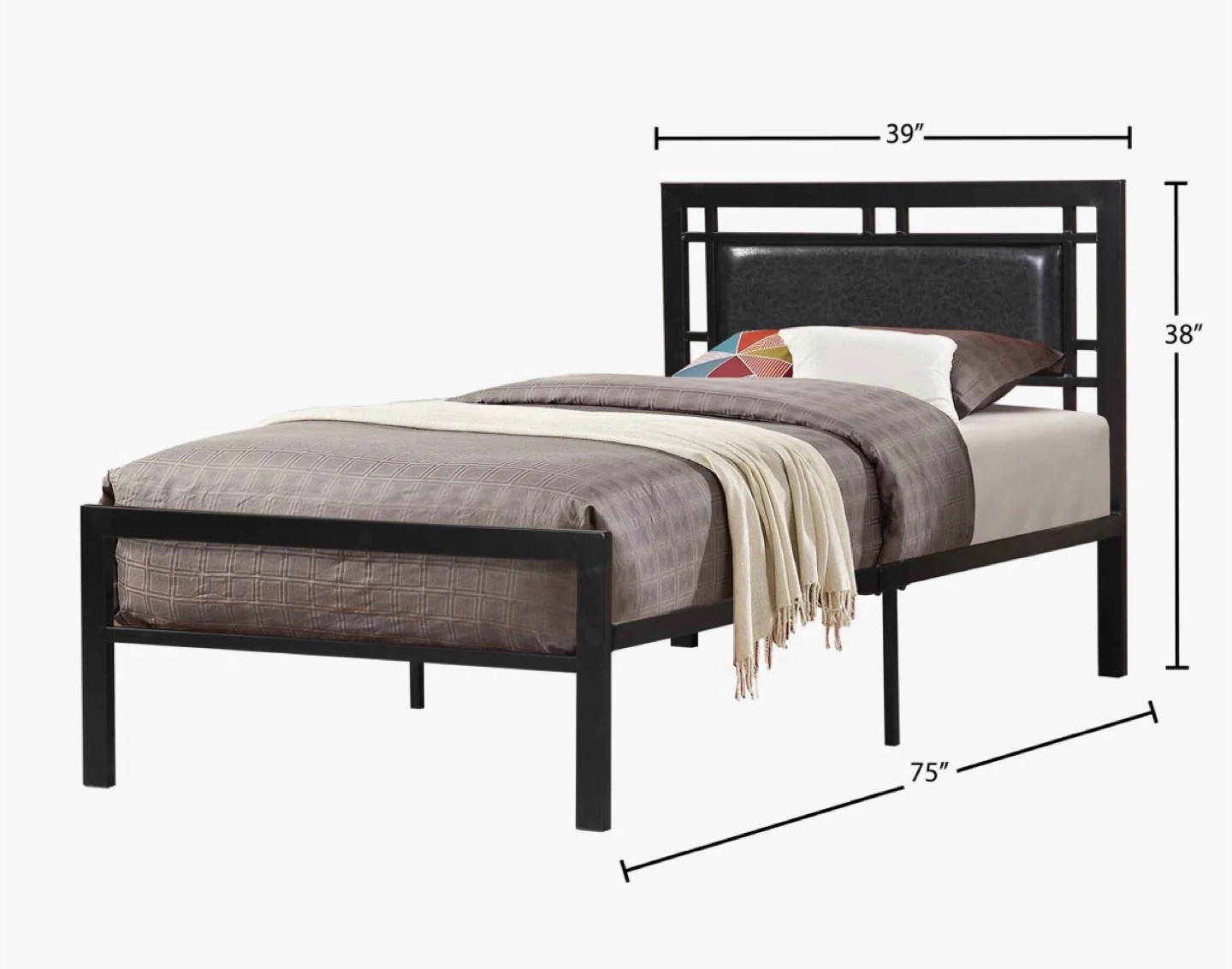 This twin bed frame features a black metal construction with a padded headboard. It's 75 inches long and 39 inches wide. The headboard is 38 inches tall. This bed frame offers a modern look for any bedroom!