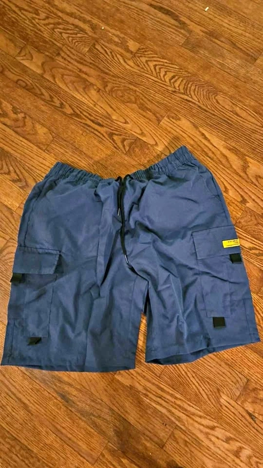 Comfy blue cargo shorts with an elastic waist and drawstring for a good fit. Features multiple cargo-style pockets. Great for casual wear.