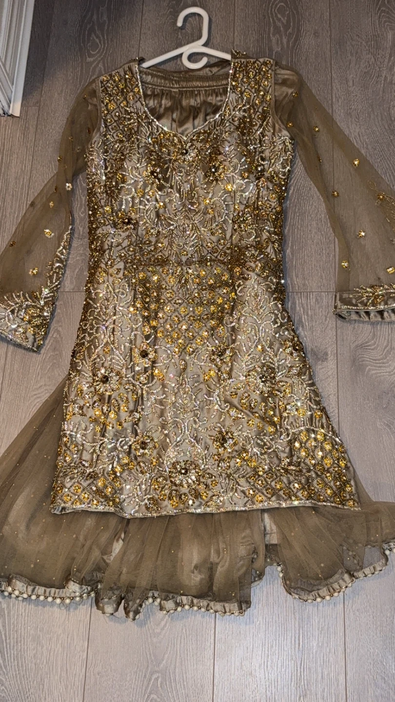 Beautiful dress with intricate gold embroidery! The colour is a lovely neutral tone, and it features long sleeves and a layered skirt. Perfect for a special occasion!