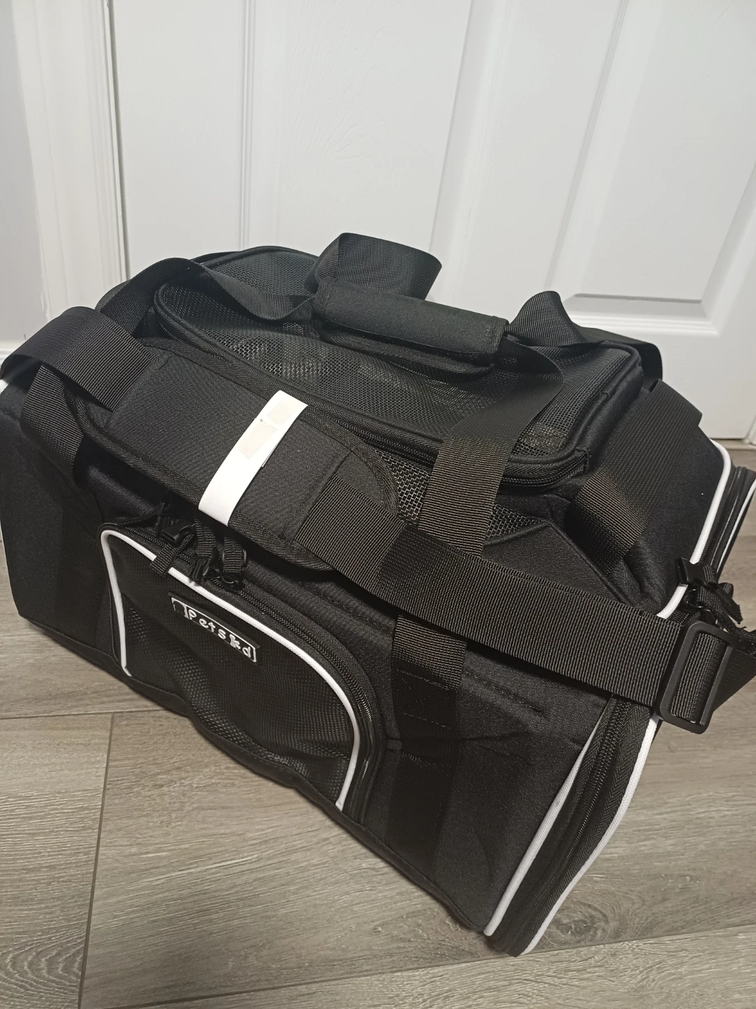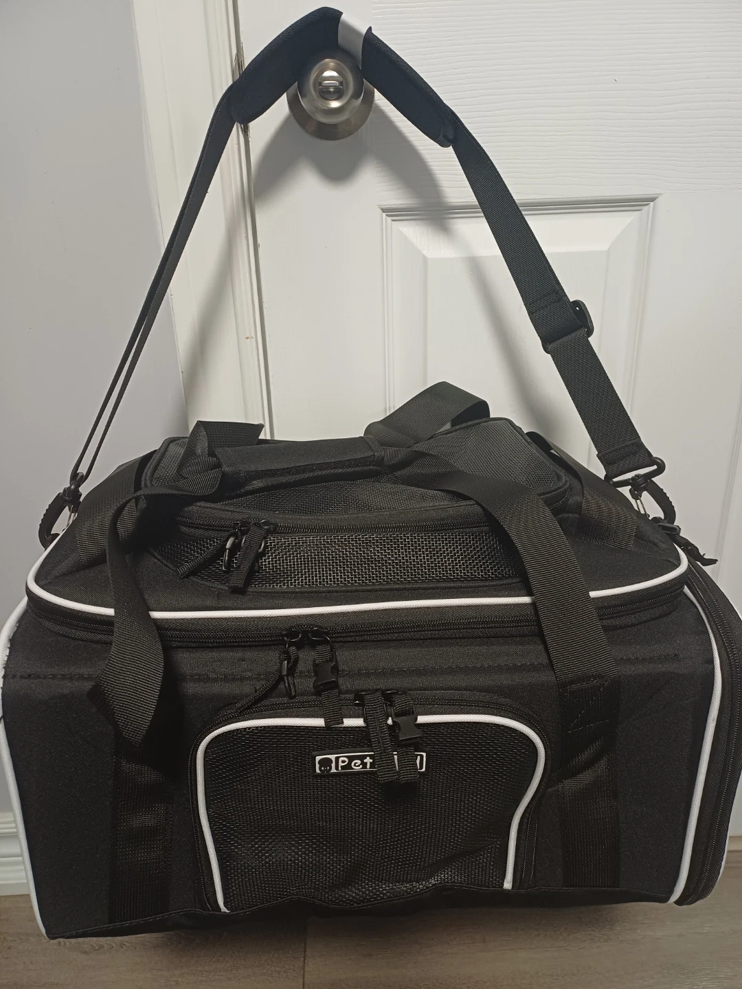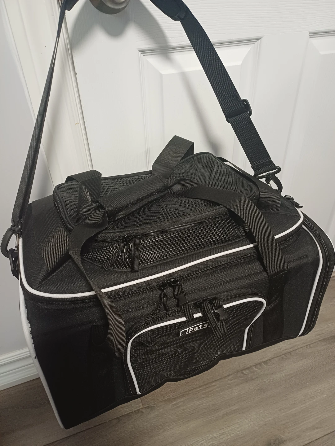 This is a black pet carrier bag from PetsGo. It features mesh panels for ventilation and for your pet's comfort with multiple zipper compartments for storage. It has both top handles and a detachable shoulder strap for easy carrying.