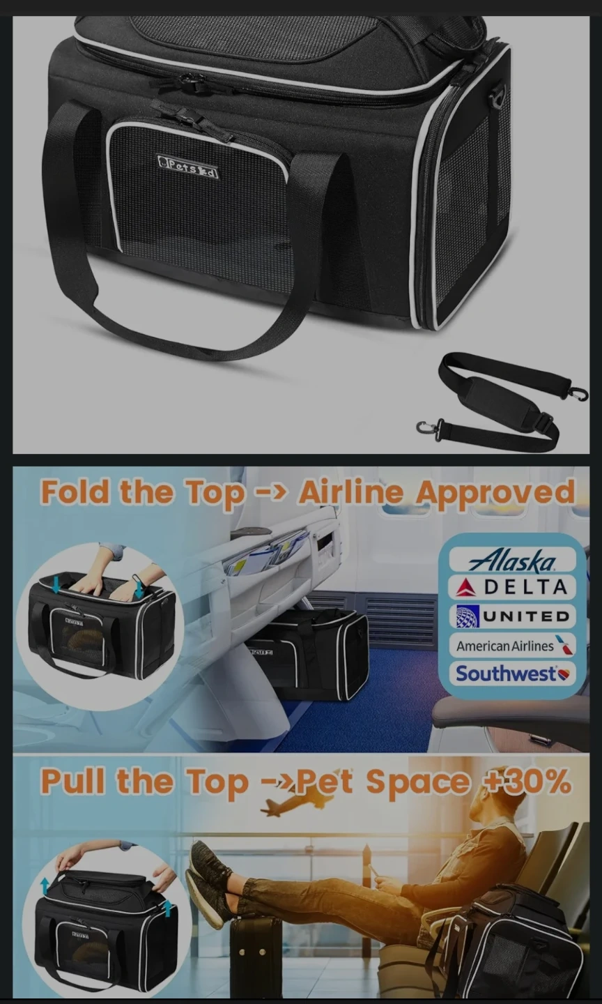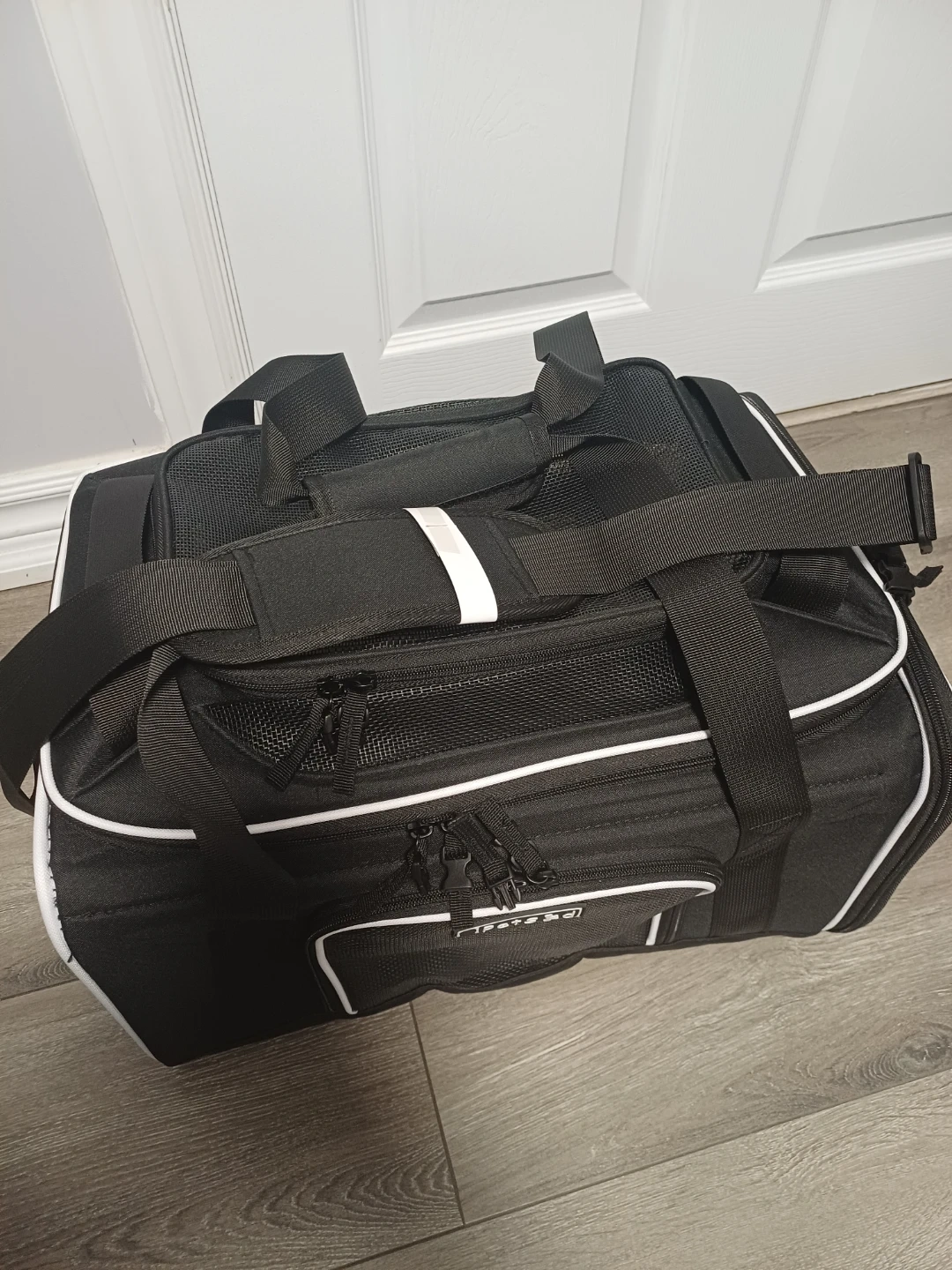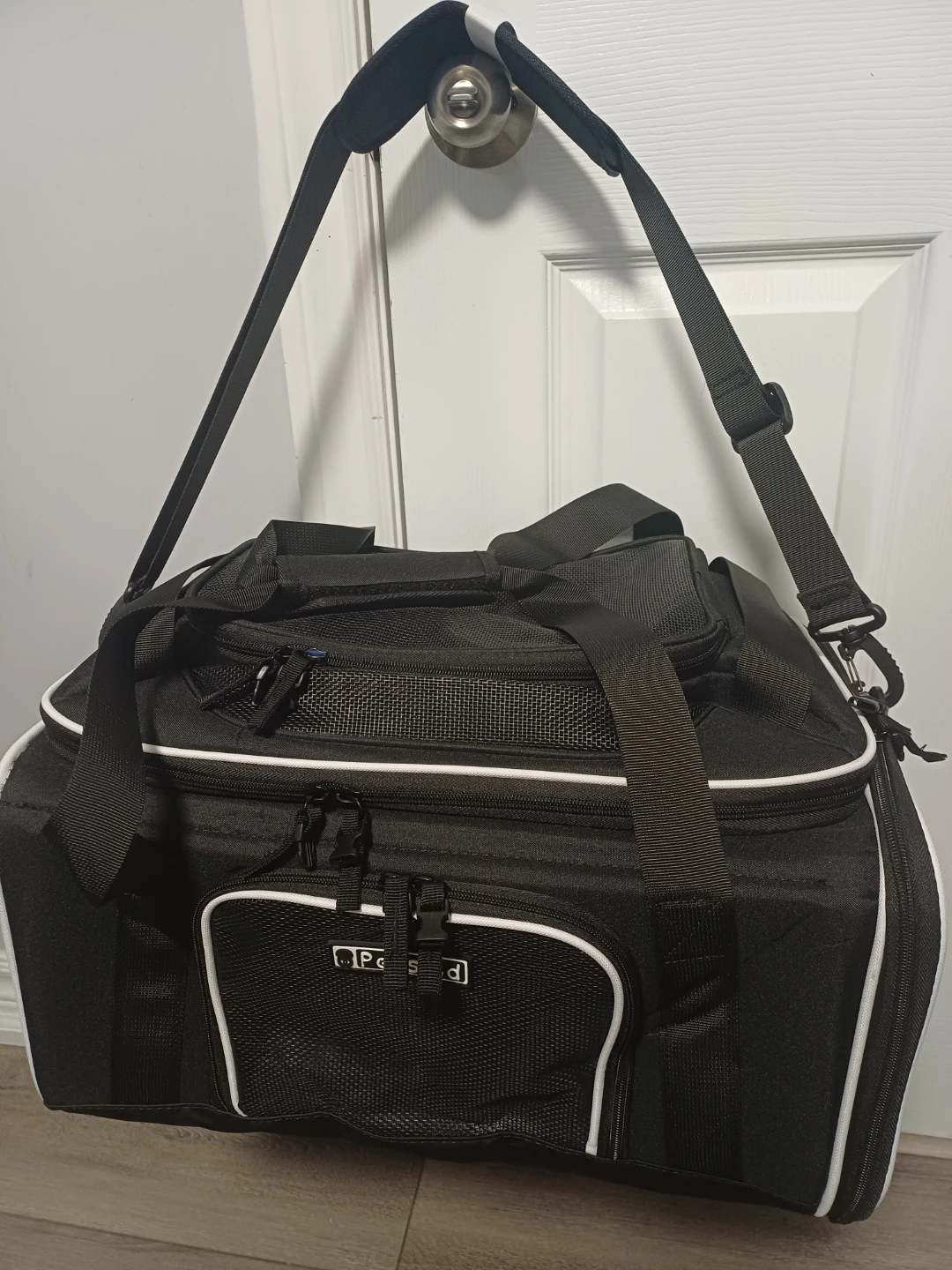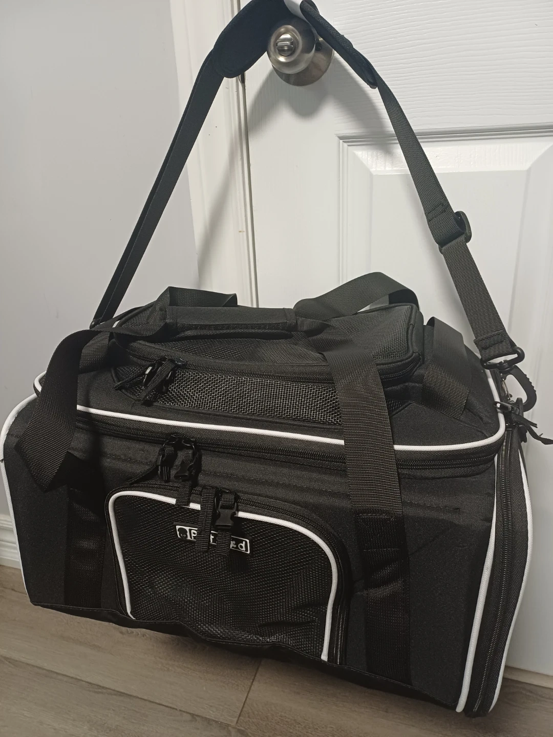 This is a black pet carrier bag from PetsGo. It features mesh panels for ventilation and for your pet's comfort with multiple zipper compartments for storage. It has both top handles and a detachable shoulder strap for easy carrying.