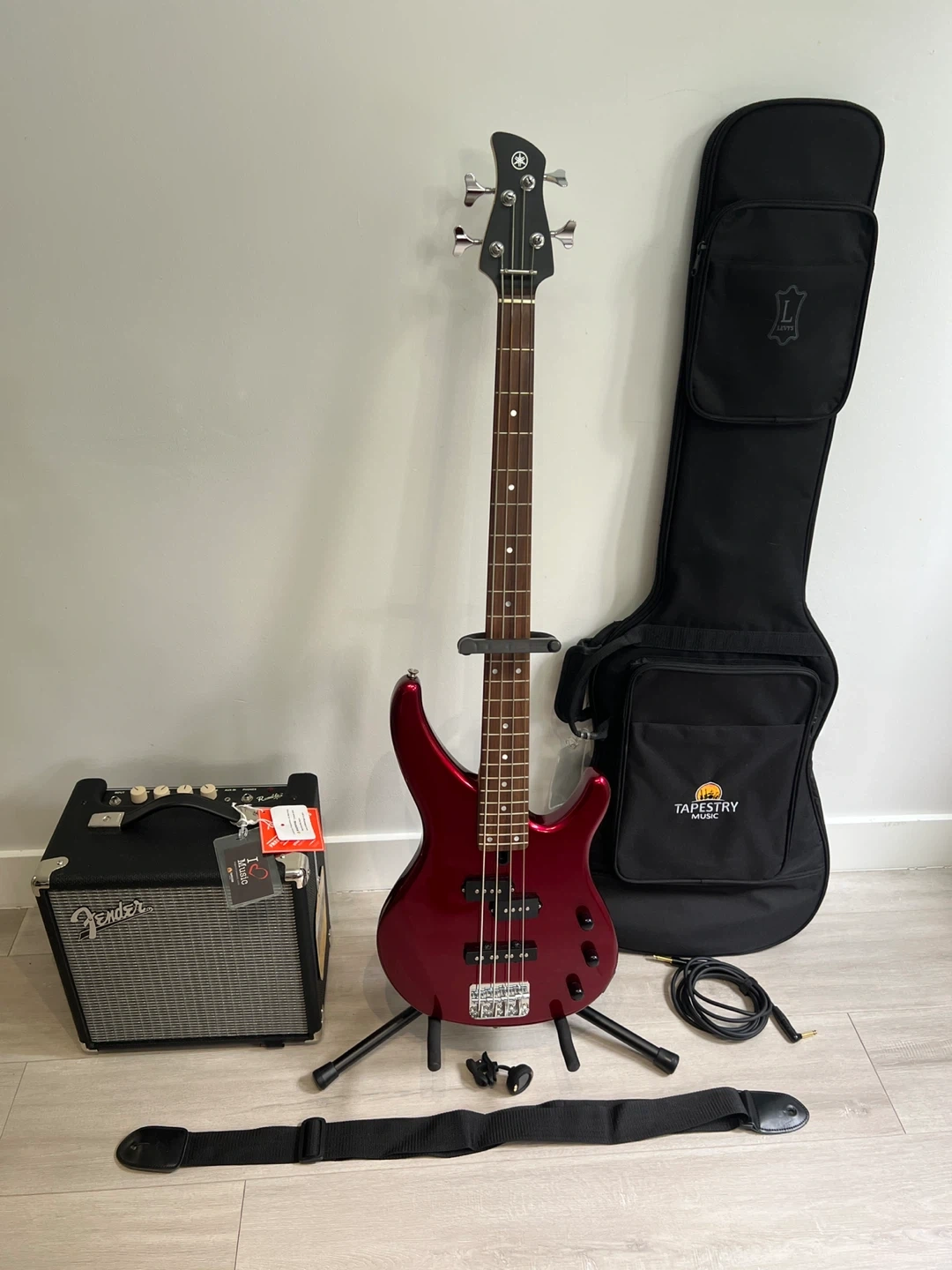 55Selling a Yamaha bass guitar. It's in great condition and ready to rock! Also included is a Fender Rumble 15 bass amplifier, a guitar stand, a strap, a cable, and a Tapestry carrying case
