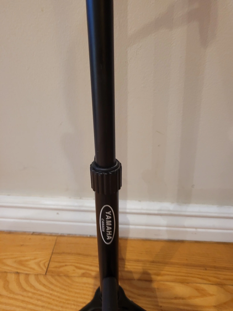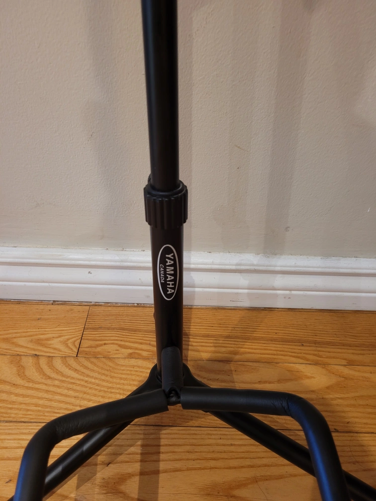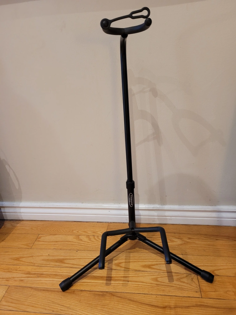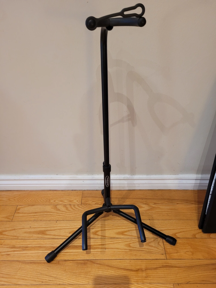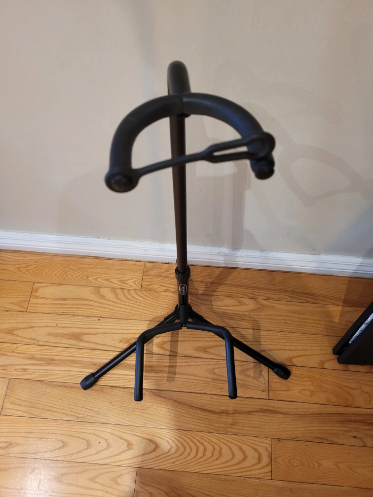 Black guitar stand. Stable, three-legged base. Durable metal construction. Simple design.