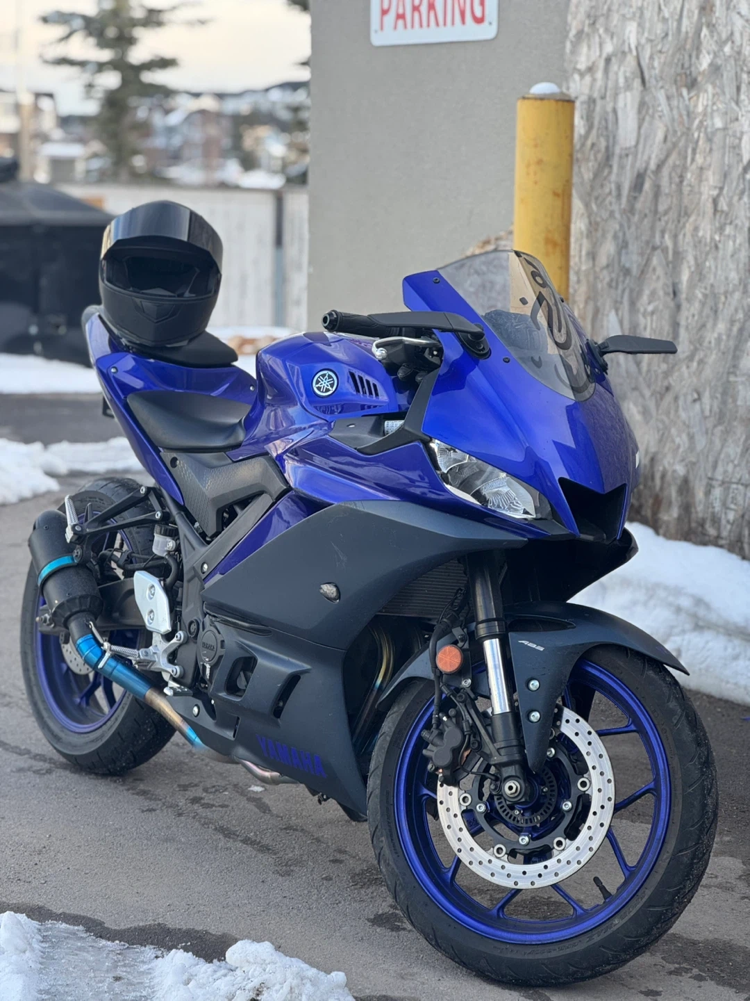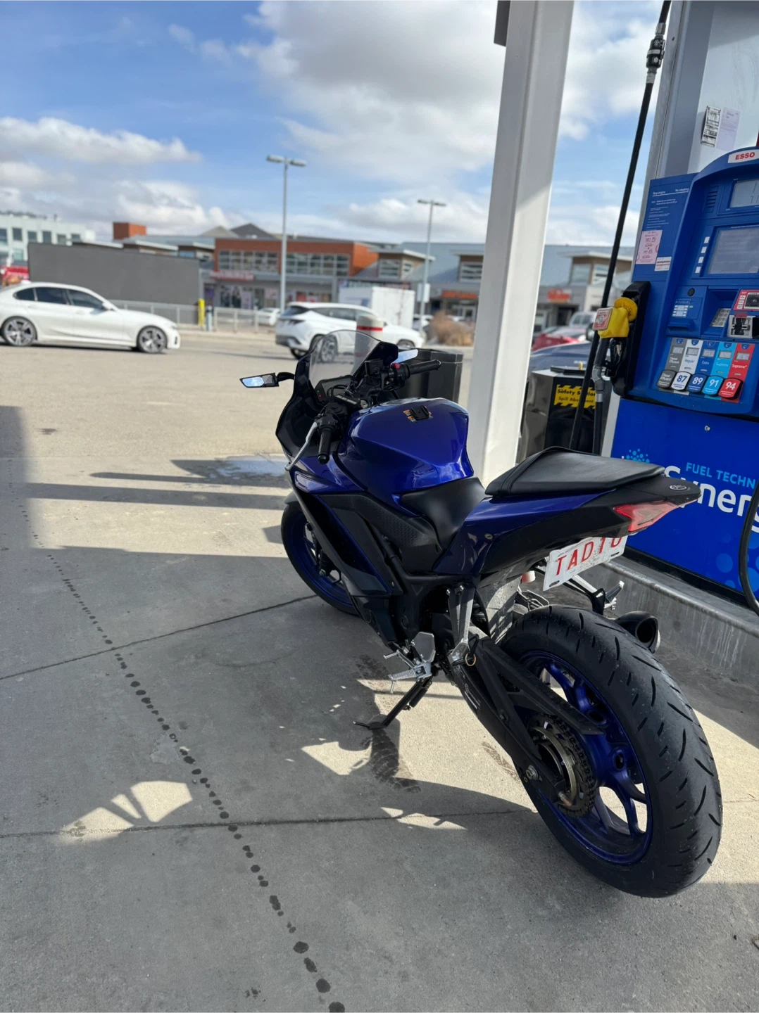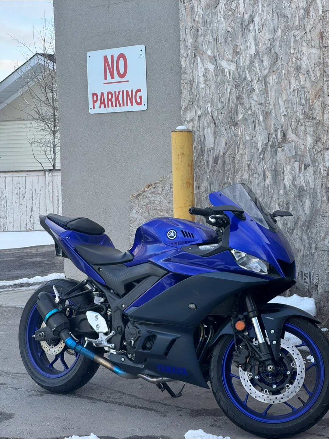 Yamaha motorcycle in blue, perfect for getting around town 2023 Yamaha r3 I am the first owner this was a amazing starter bike for me and I still ride it because of how much fun it is but sadly I have to part ways due to financial reasons, I’m hoping to find a good second owner for it 6k firm Only cons are that it has frame damages and no licence plate bracket Mechanically flawless all maintenance are up to date even tires Has after market turn signals total cost $500+ Has aftermarket full titanium exhaust $900+ Aftermarket suspension $1200 I also still have stock exhaust and stock mirrors in good condition I will trade for either a car or a talaria Komodo, stark varg, 600cc or higher or a super moto