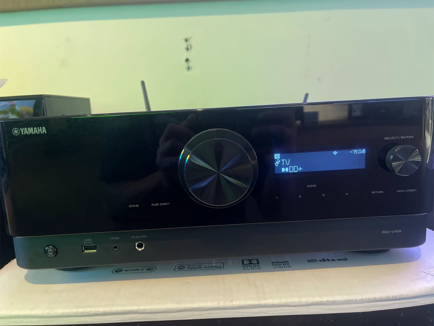 16For sale: Yamaha RX-V4A AV receiver in excellent condition, fully functional with all features operational. Includes remote and original accessories.