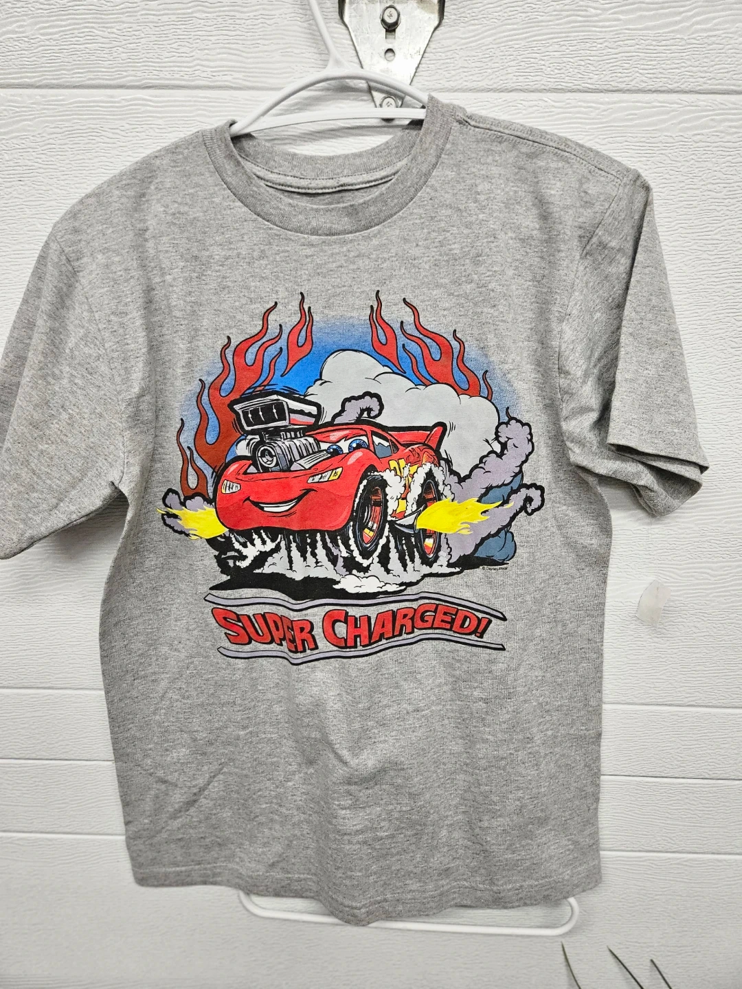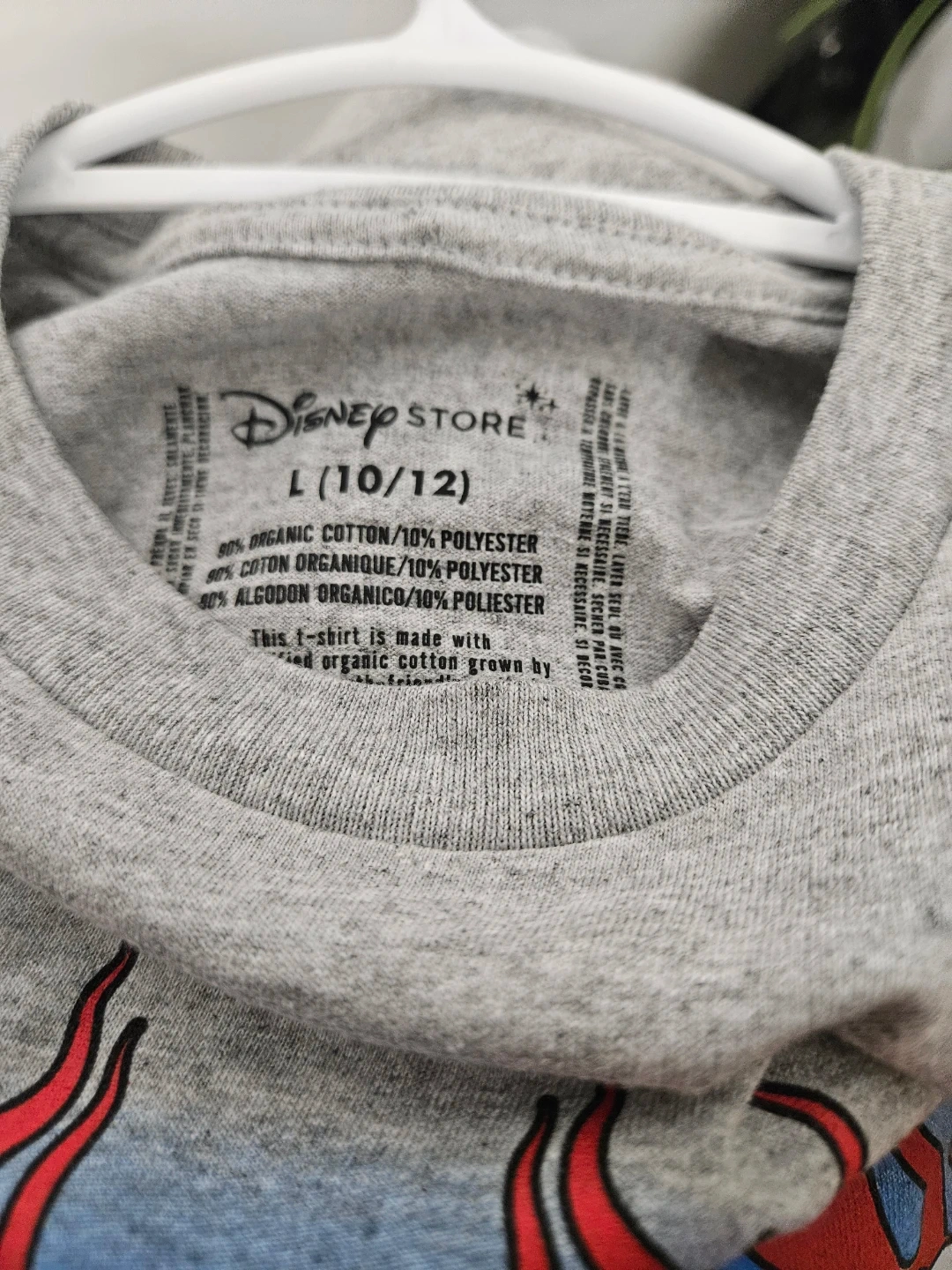 Selling a Disney Store Cars T-shirt in size L (10/12). The shirt is grey and features a super charged car design. It's made with 90% organic cotton and 10% polyester